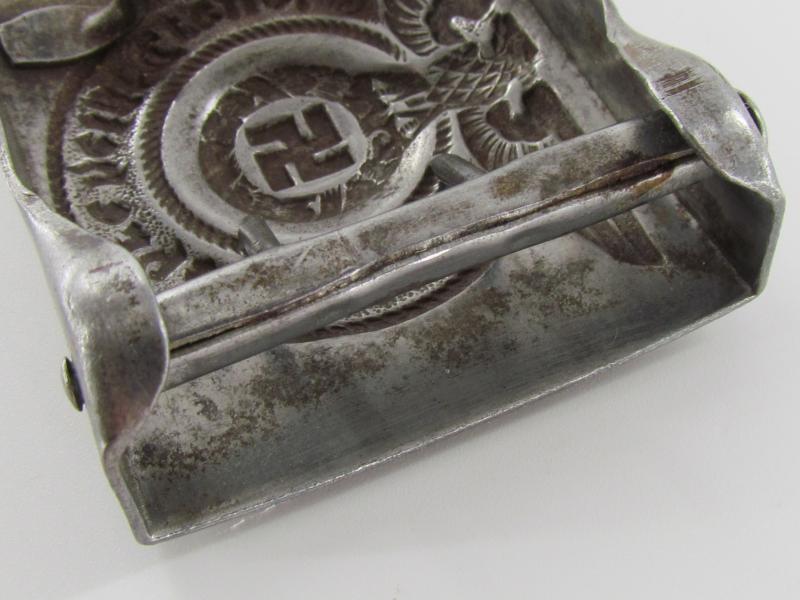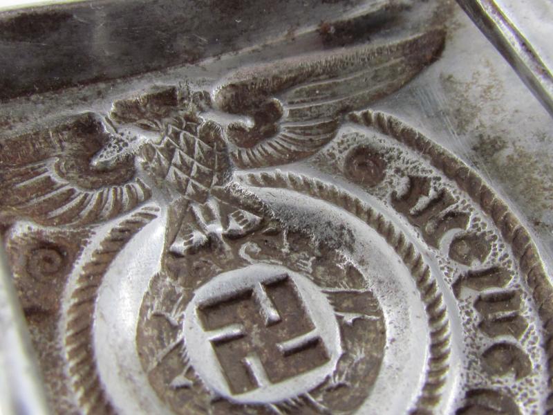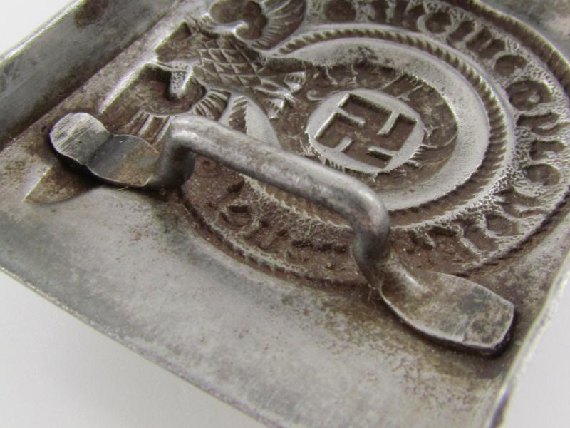 These buckles where made later in the war and came unmarked. A textbook buckle in good used condition with some of its original factory silver finish!