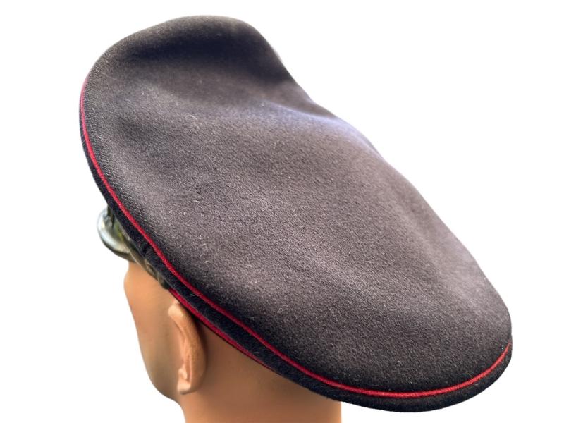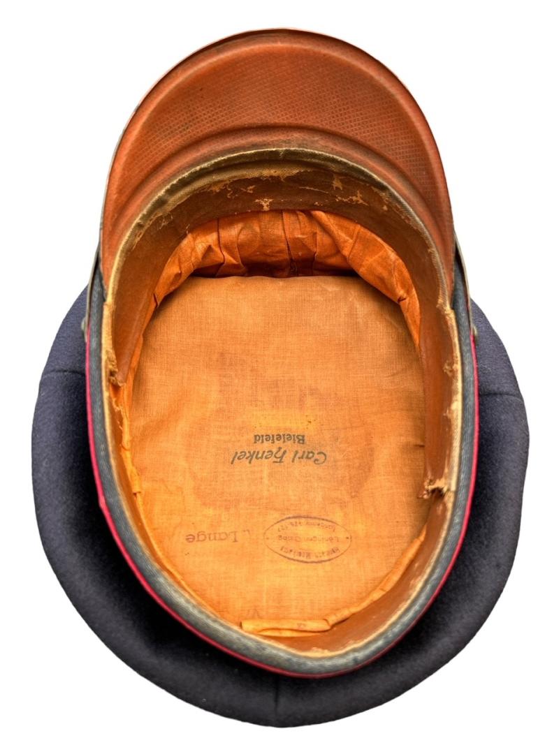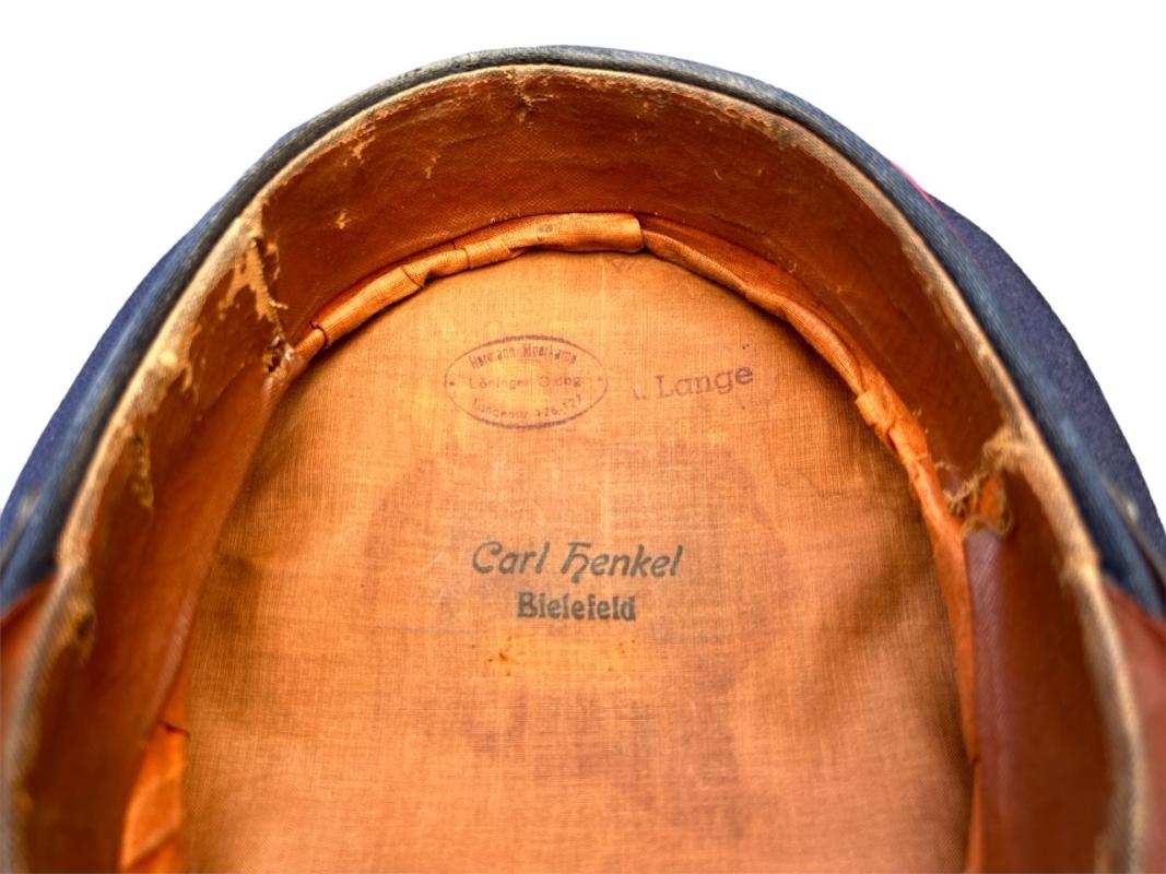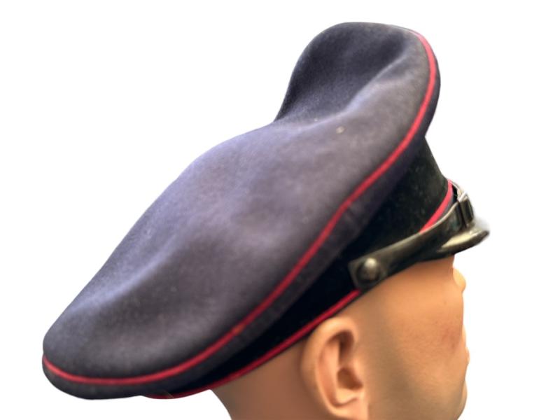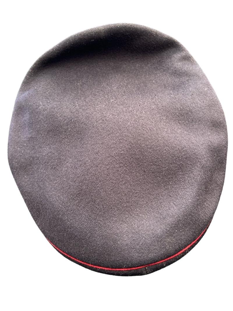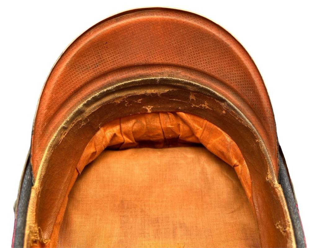 It is fabricated from very dark navy blue worsted wool cloth, with wide black velvet cap band, plus two rows of saddle carmine red (karminrot) color piping around the circumference.