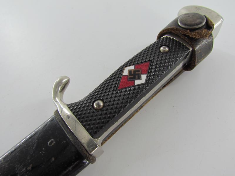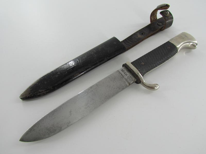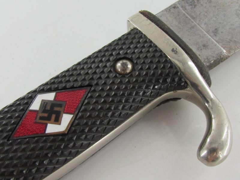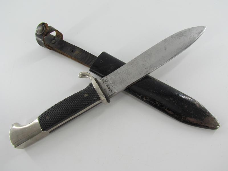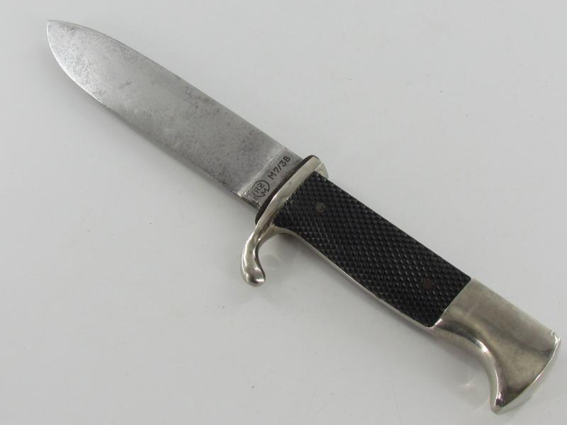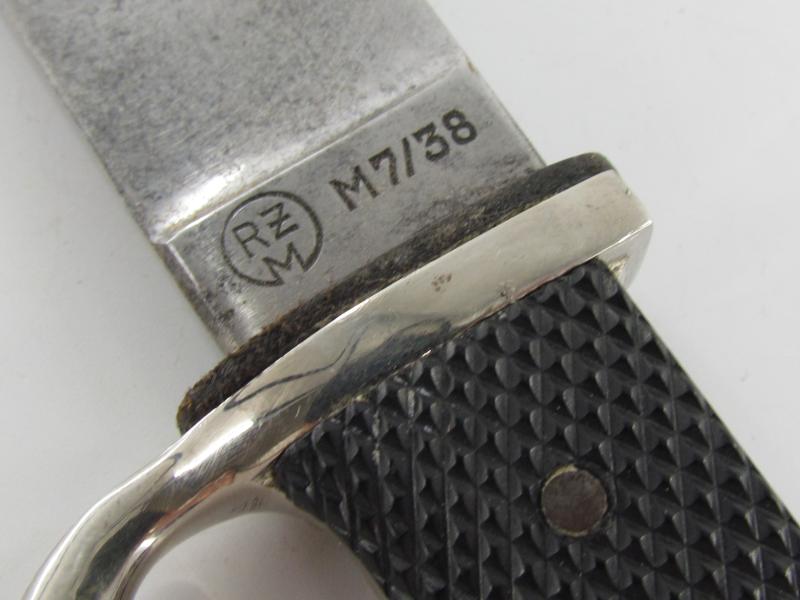 German Hitler Youth Knife. Bright blade without Motto, Maker mark on the ricasso "RZM M7/38" ( "Paul Seilheimer" of Solingen). The enamel HJ insignia is also in very good condition