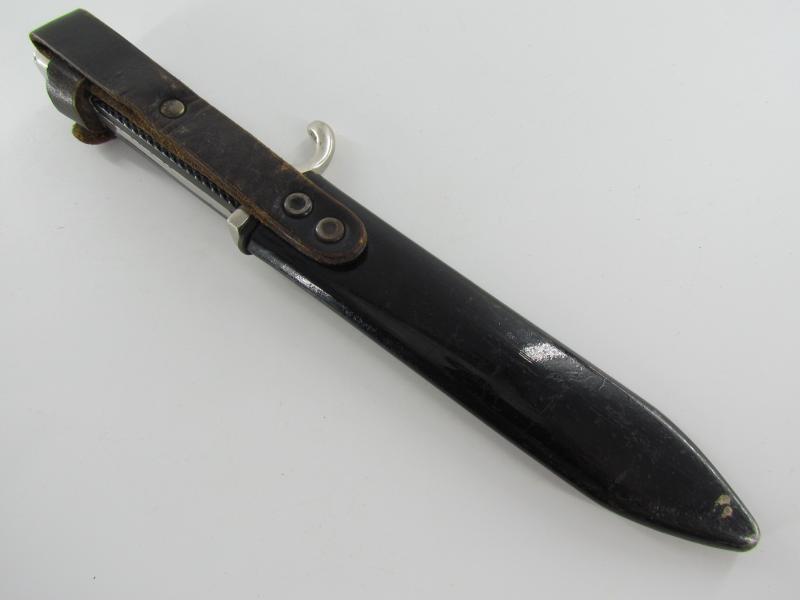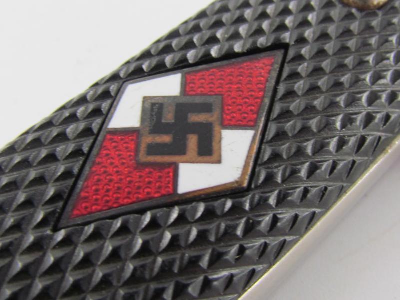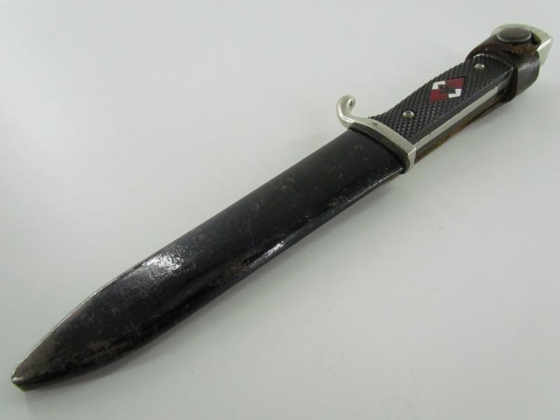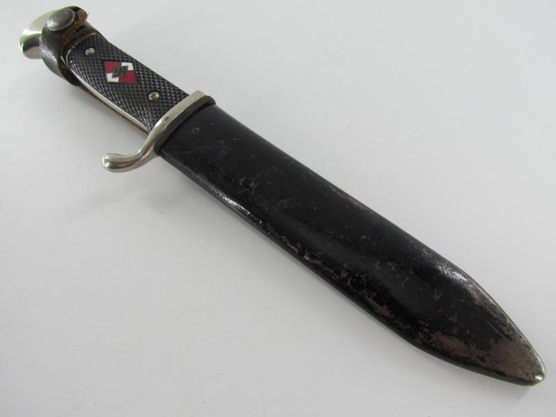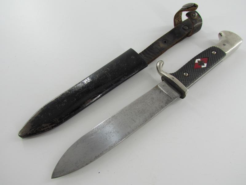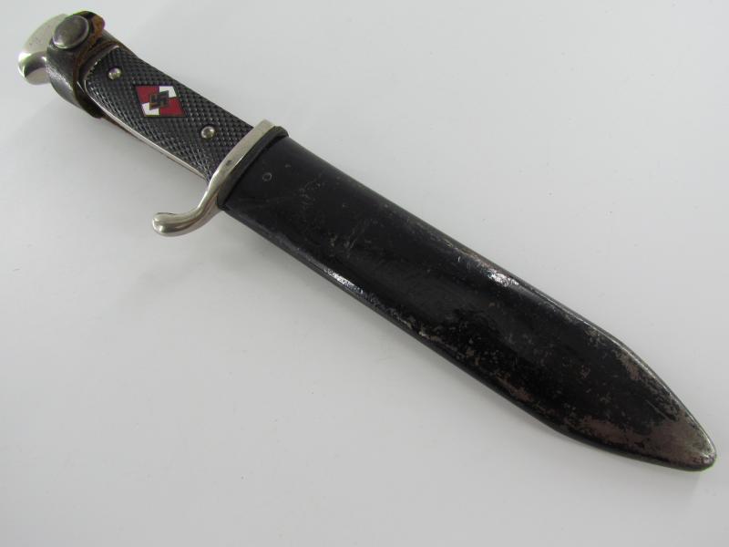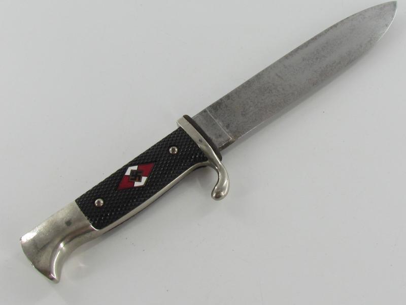 German Hitler Youth Knife. Bright blade without Motto, Maker mark on the ricasso "RZM M7/38" ( "Paul Seilheimer" of Solingen). The enamel HJ insignia is also in very good condition