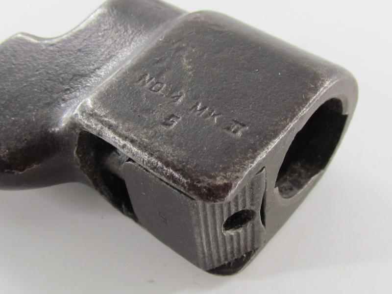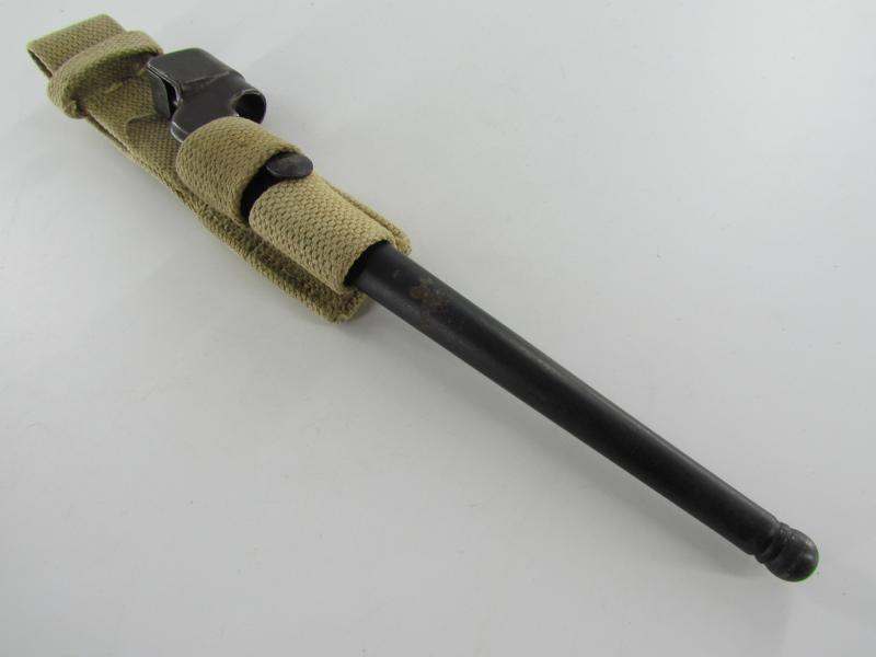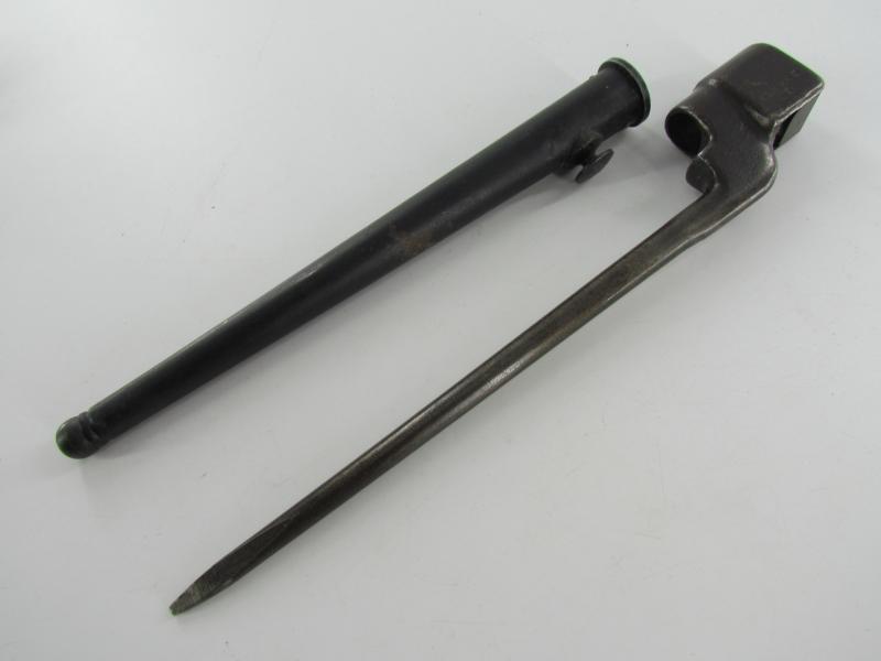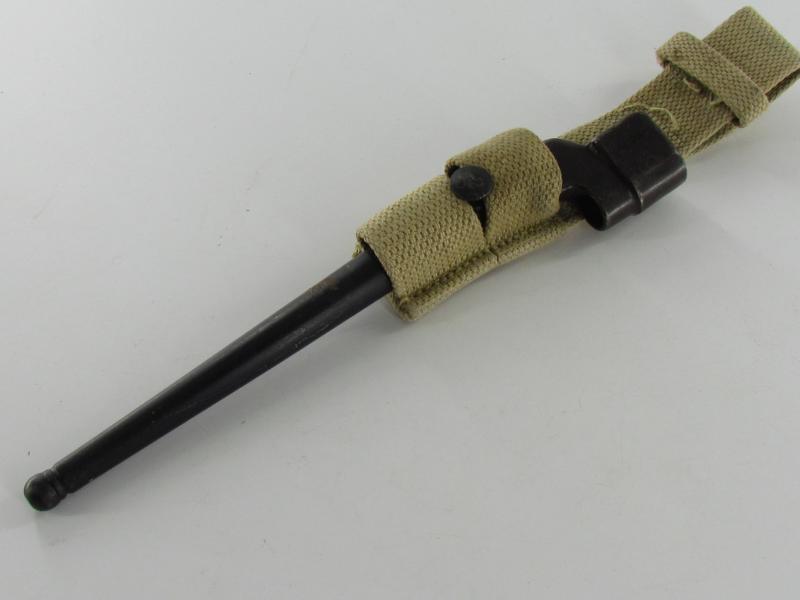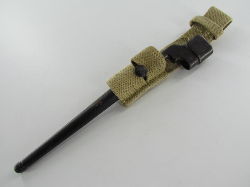 British Spike Bayonet No.4 MK II, complete with webbing frog. Nice original bayonet and frog in good used condition!