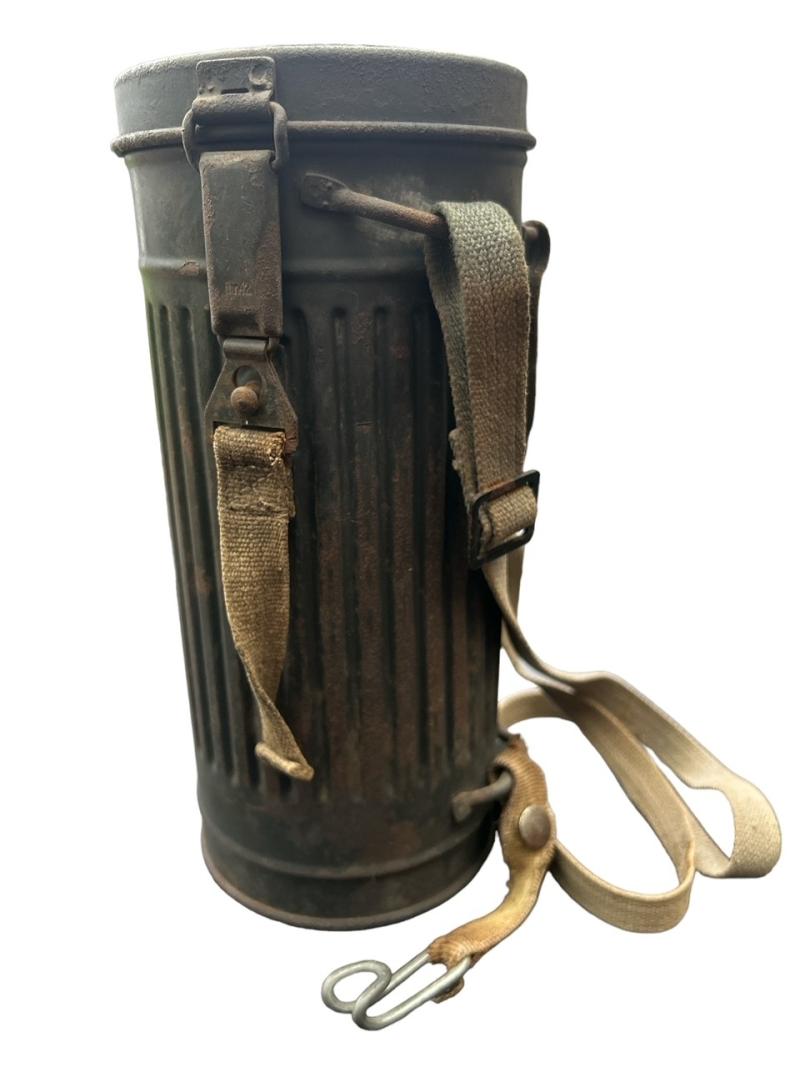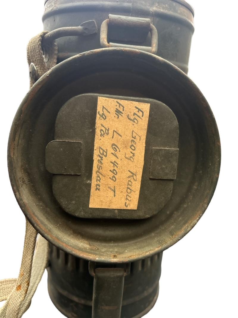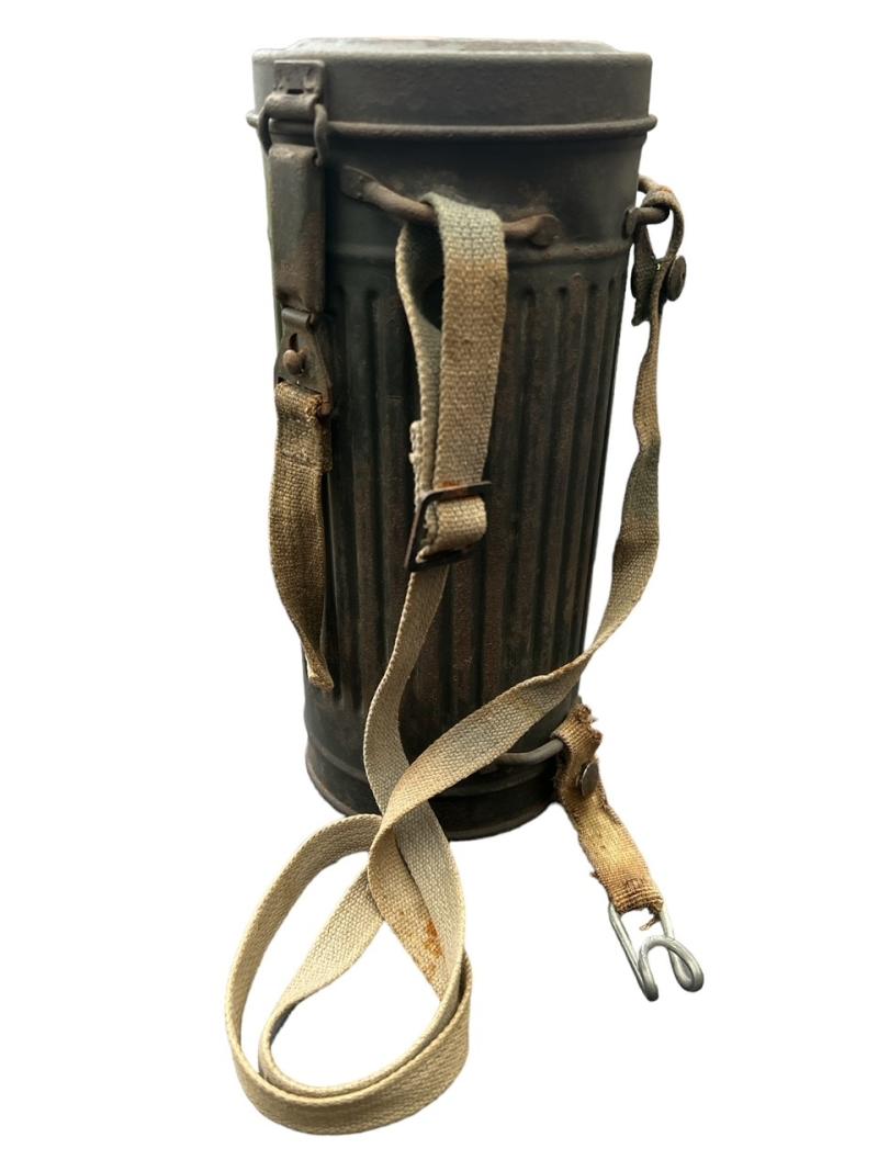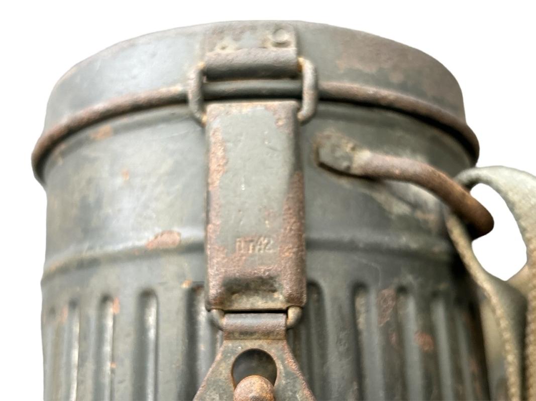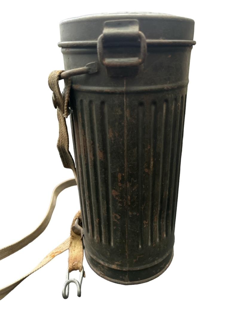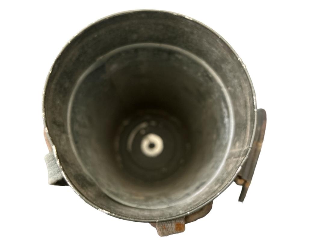 A very nice and complete Blue/grey gasmask cannister. The outside is in very nice condition and shows some small spots of rust and has some nice wear to it.