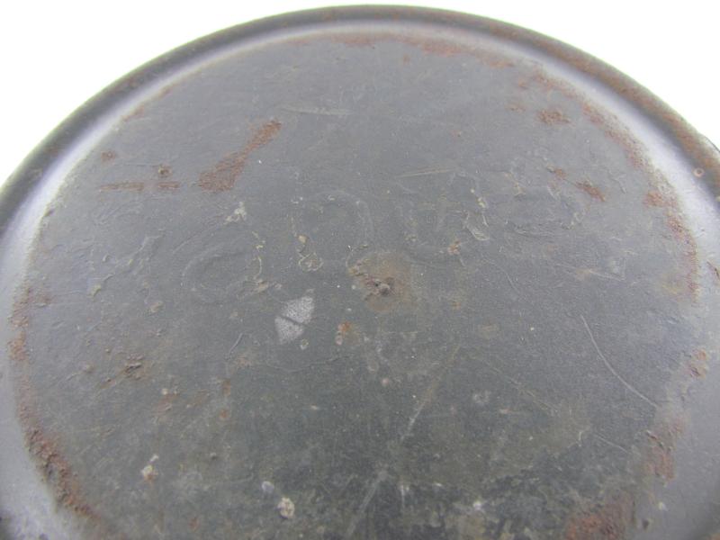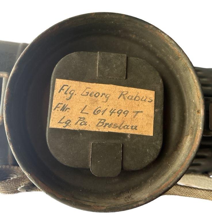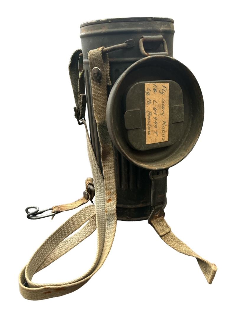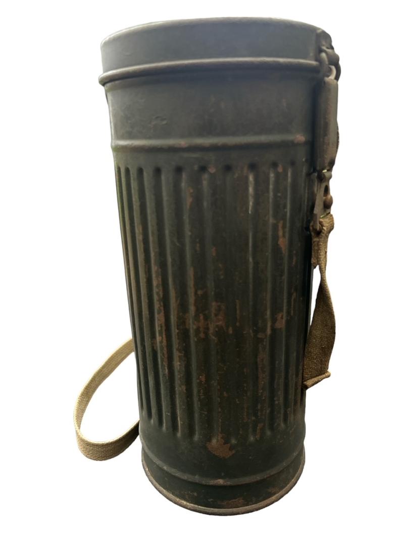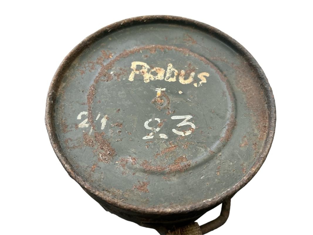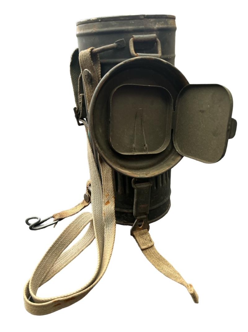 A very nice and complete Blue/grey gasmask cannister. The outside is in very nice condition and shows some small spots of rust and has some nice wear to it.
