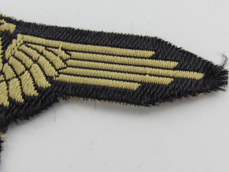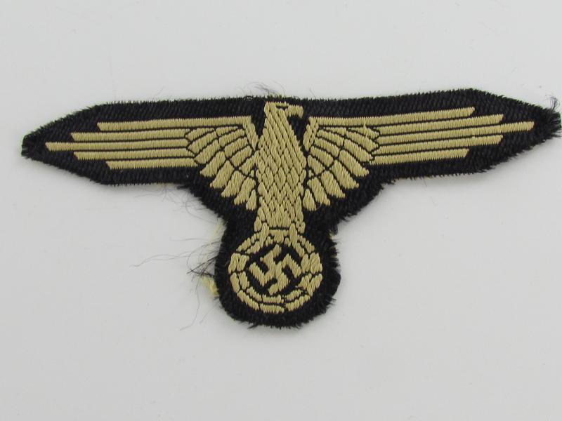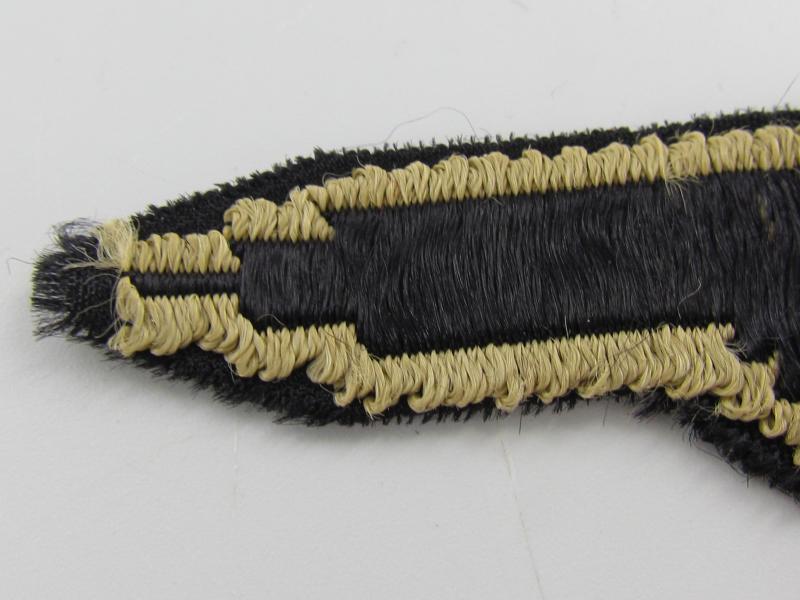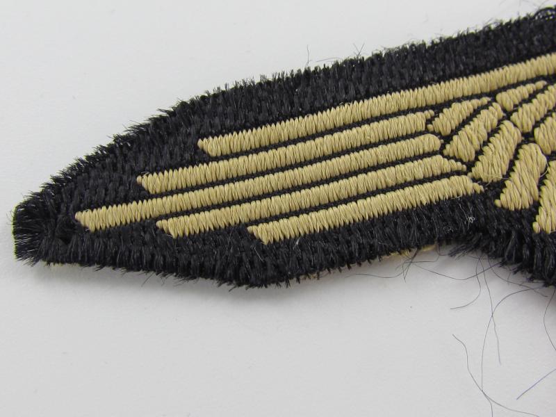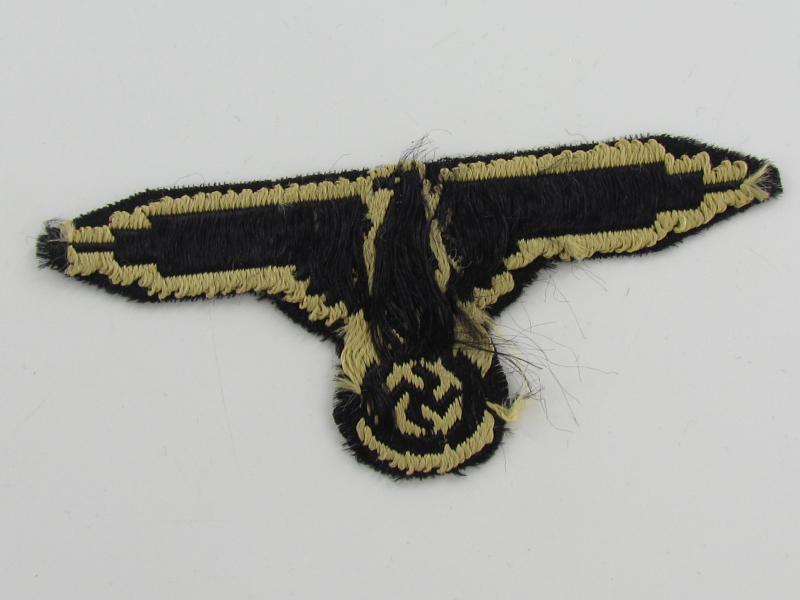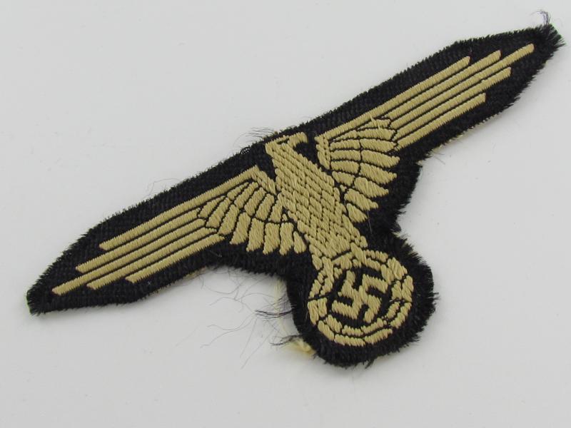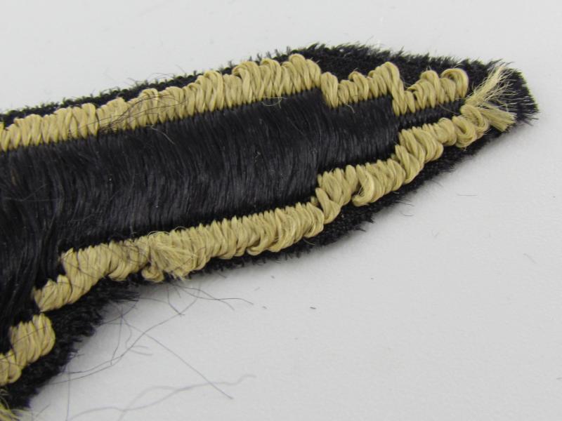 This is a nice BeVo-woven Waffen-SS ('tropical') Sleeve Eagle (Ärmeladler). The tropical version of the Waffen-SS sleeve eagle was introduced in december 1942 for wear on the tropical uniforms. This BeVo machine woven version was to be worn by EM/NCO’s. The eagle is executed in golden-yellow linnen on a black linnen background. These arm-eagles were also worn on the M44 'Dot-pattern' camouflaged 4-pocket-tunics