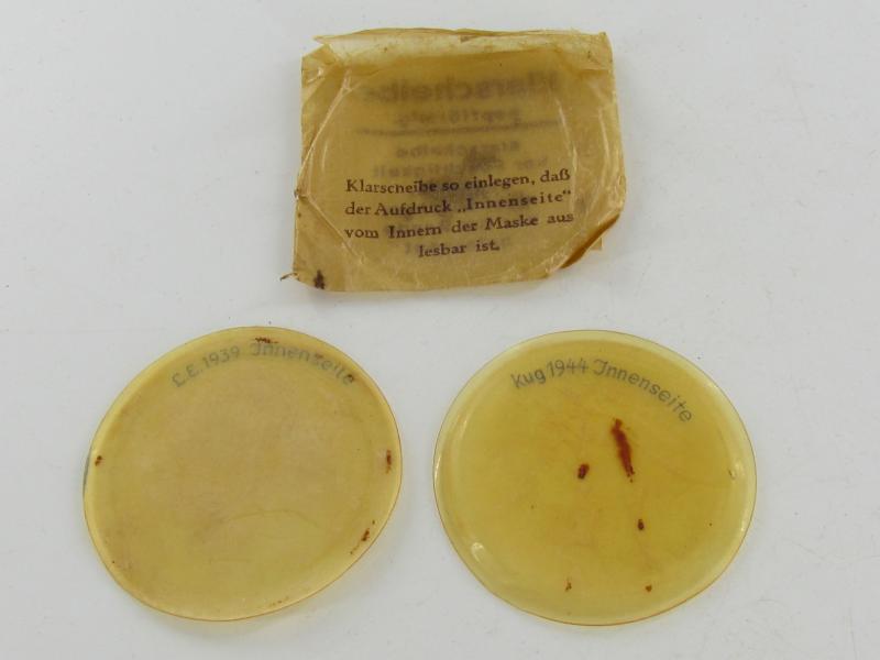 German Wehrmacht Klarscheiben Clear Lenses For Gas Mask Set Of Matching glasses Dated 1939 + 1911 in good condition