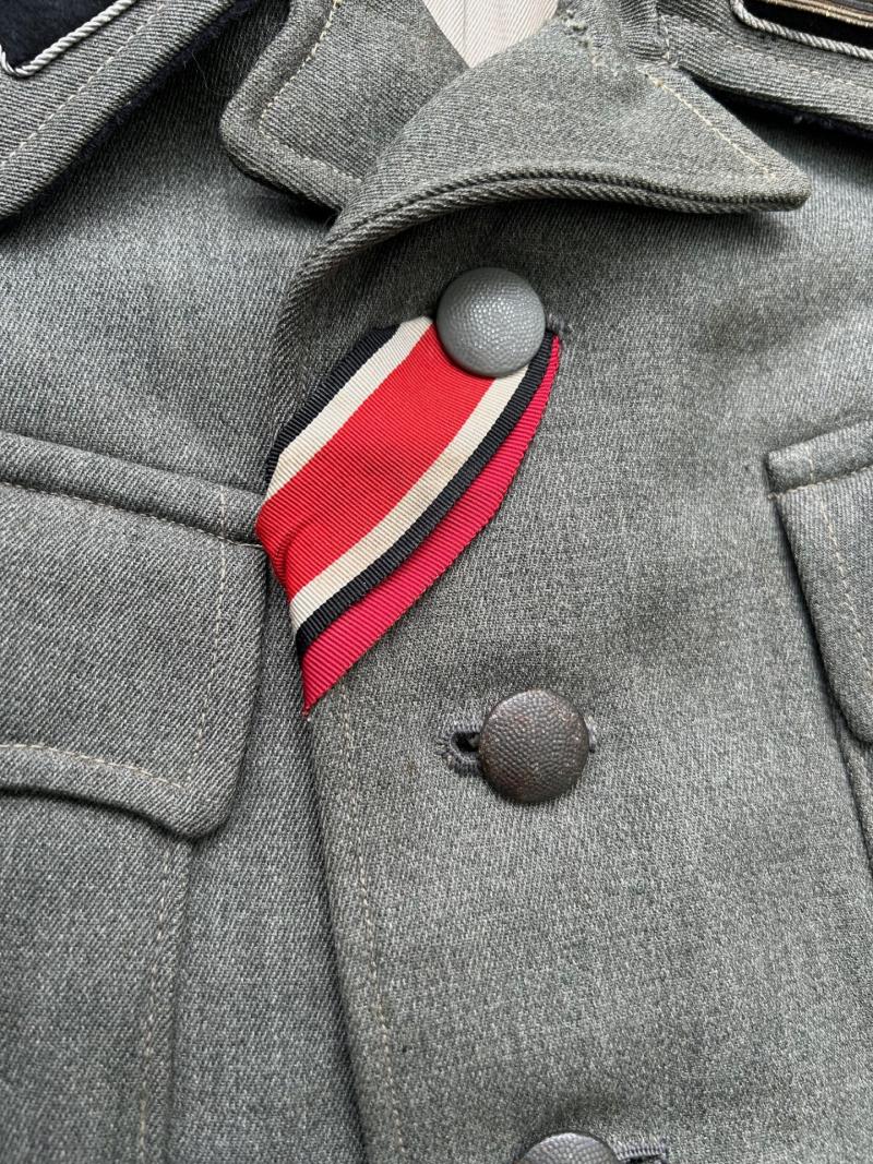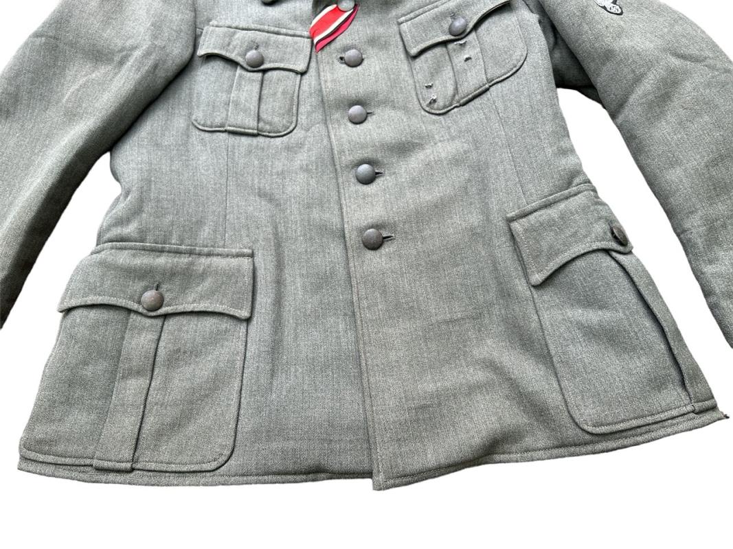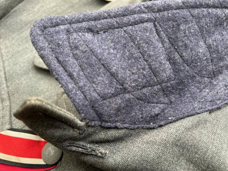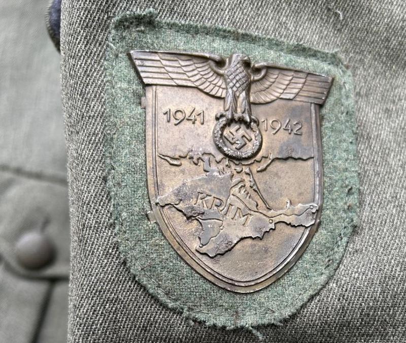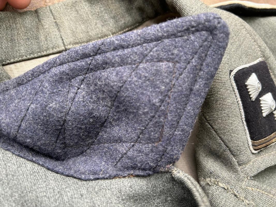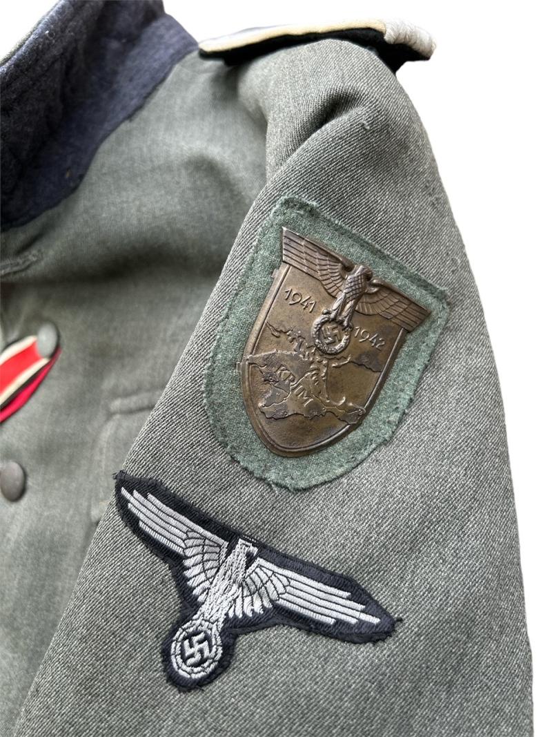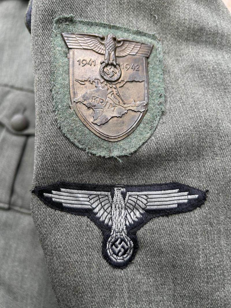 The tunic has its originally sewn officers sleeve eagle, traces of a cufftitle being worn, and the rest of the insignia are original but restored in my opinion.