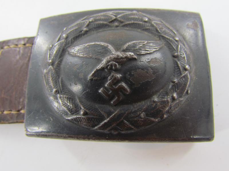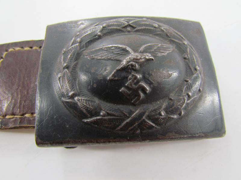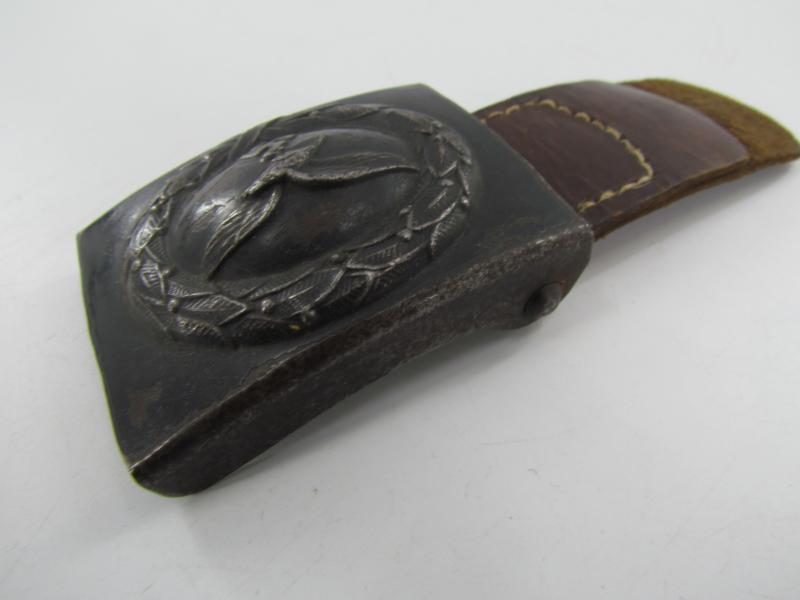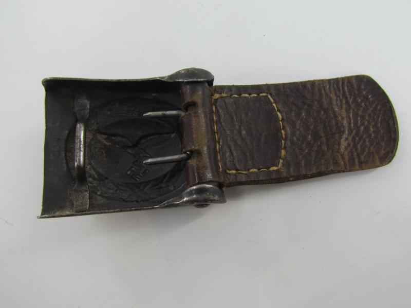 mid war steel Luftwaffe buckle with leather tab in light worn condition. Still retaining parts of its original blue finish on the front. The reverse of the buckle is engraved with the Schmöle logo (An arrow with S and C on both sides, dated ’1940 below).