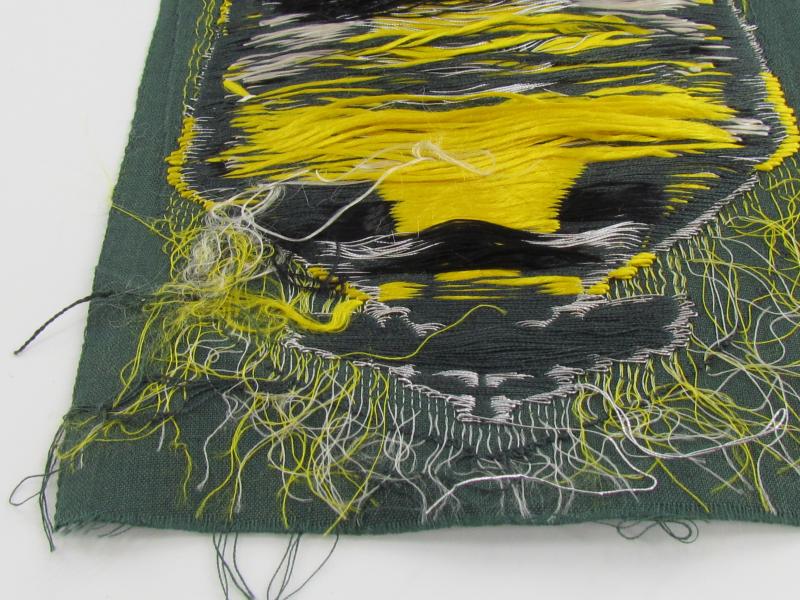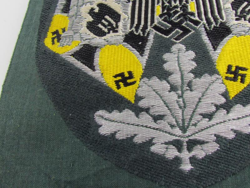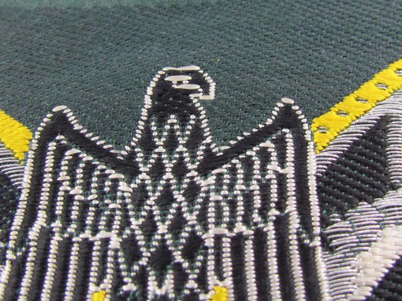 The Army Bevo woven arm shields are one of the most attractive and largest of the Bevo weave items of Third Reich insignia. They each are coloured in the correct colour for the arm of service. This is yellow for signals. Beautiful weave with lovely yellow colour set out against the black and silver.