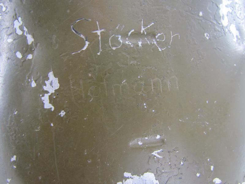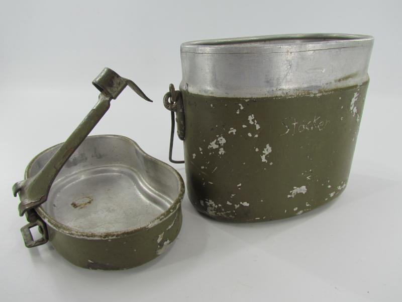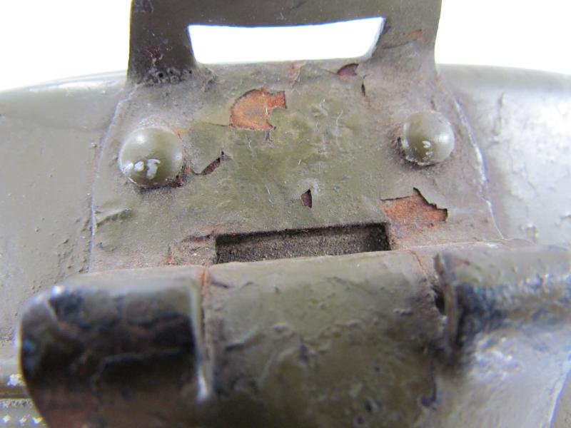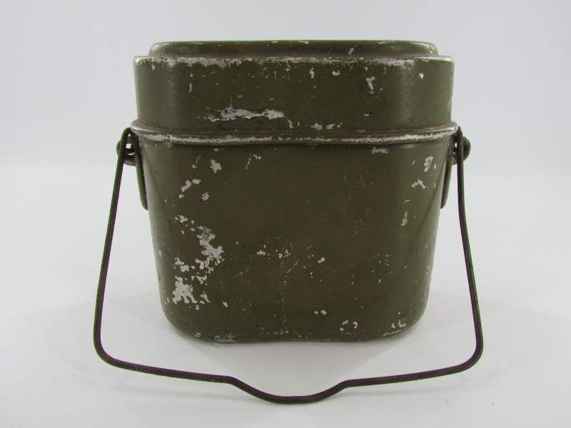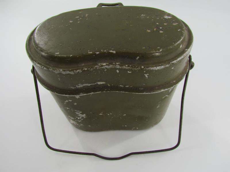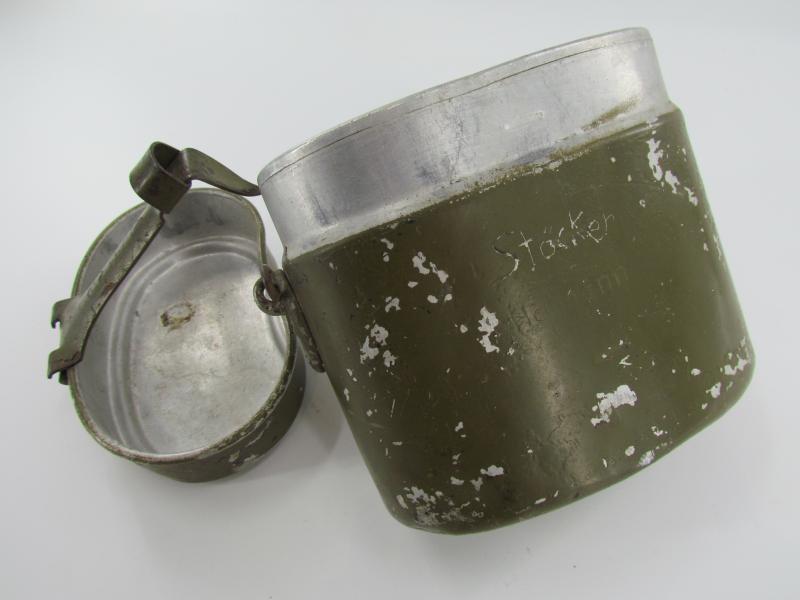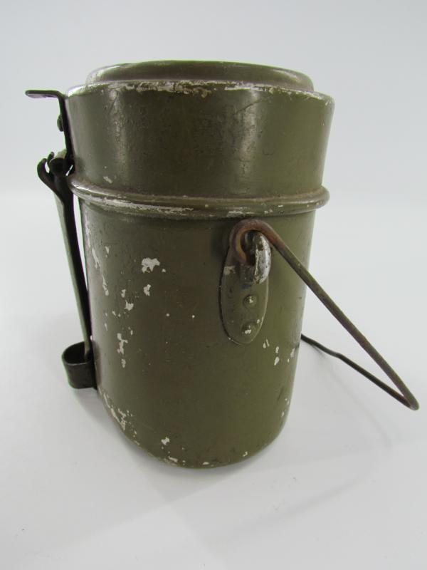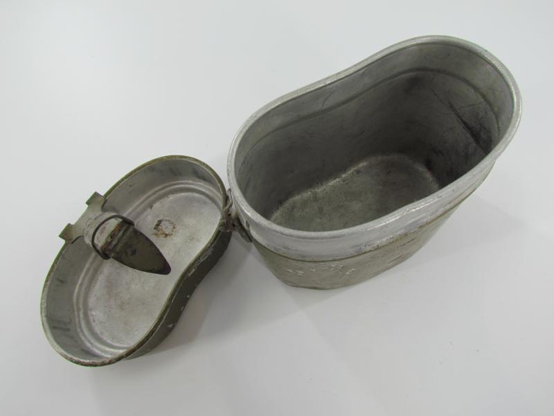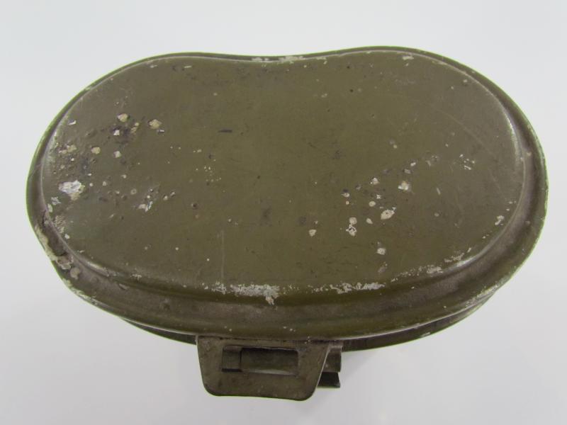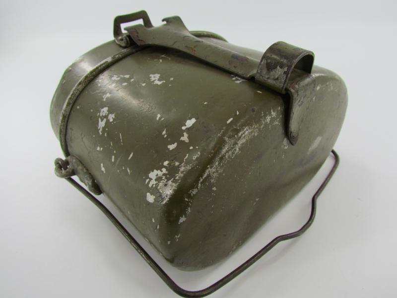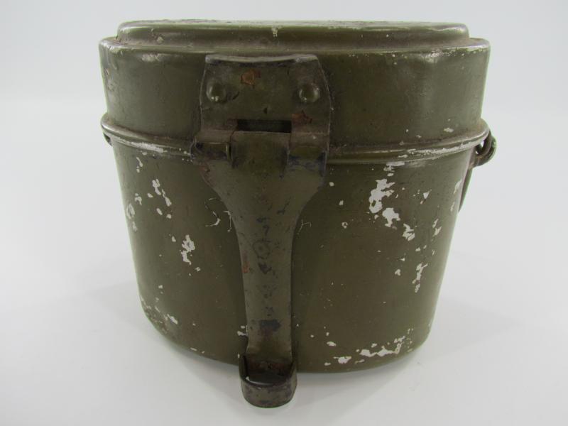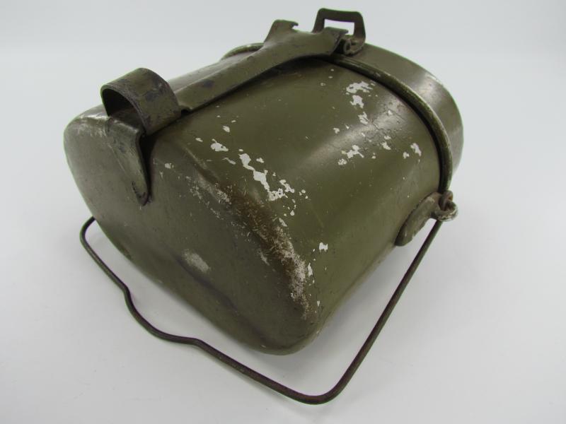 The lid is marked but very hard to read. The lower part is an early type with early aluminium attachment lugs for the carrying handle which is marked VDNS Sold as found