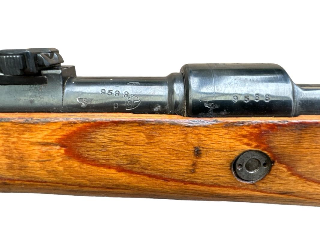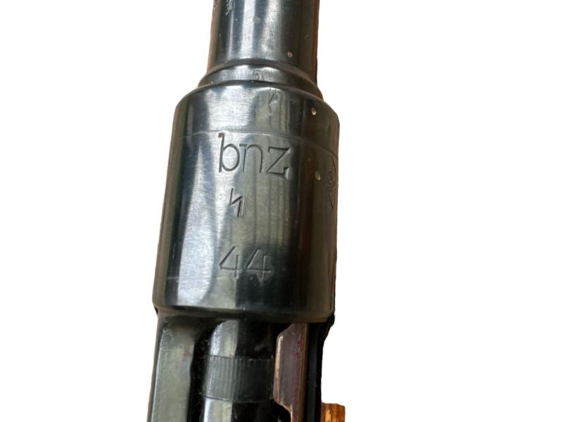 Deze K98 heeft een SS rune erop staan maar naar onze mening is dit wapen niet origineel gemaakt in het Gusen Sub kamp van concentratiekamp Mauthausen ( Single Rune SS Contract K98k Rifle )
