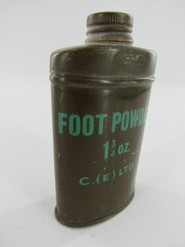 British WW2 Foot Powder Nice metal can British WW2 foot powder with content Made by “C.(E) Ltd” content “1 3/4” oz. in very good condition. Nice for a personal items collection.