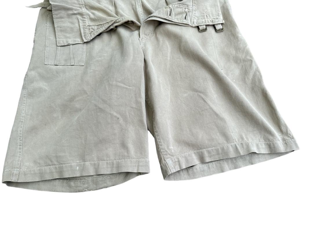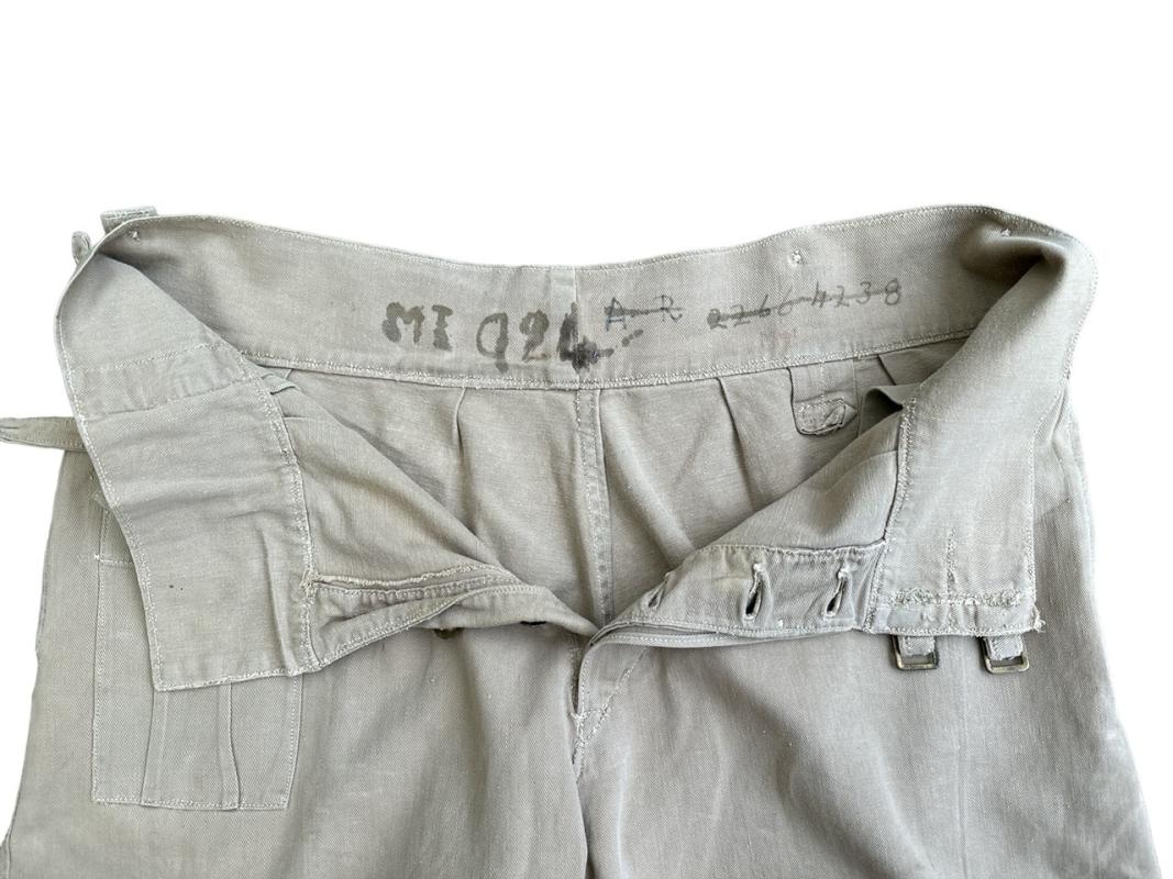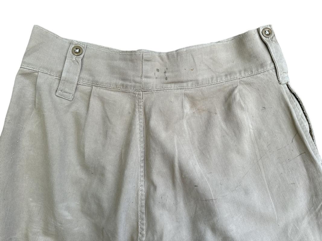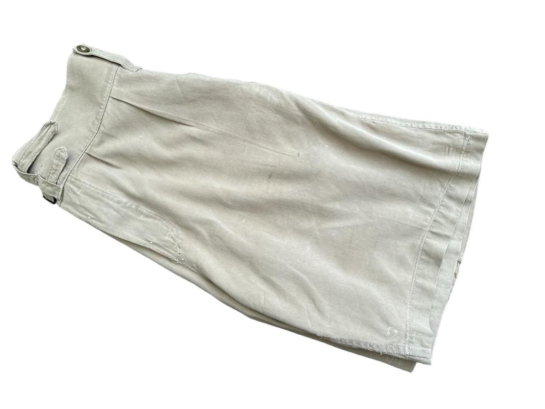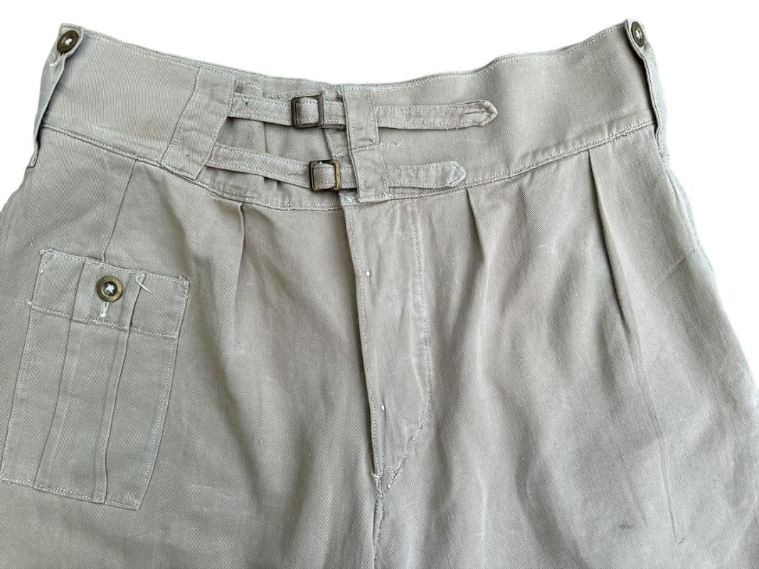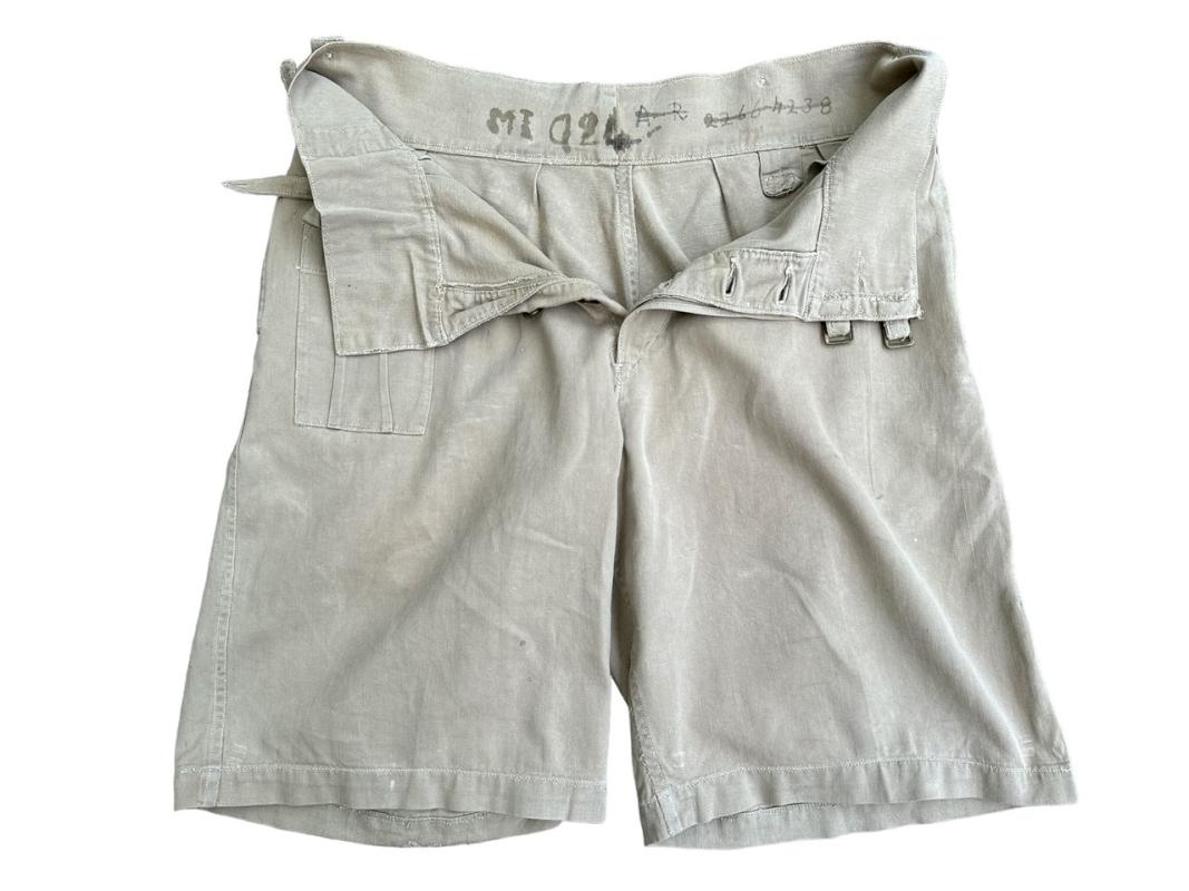These shorts are clearly British made and much rarer than theatre made examples. They are the standard 1941 pattern with the first field dressing pocket placed on the right hip, brass buttons and the double belt and buckle closure to the waist.