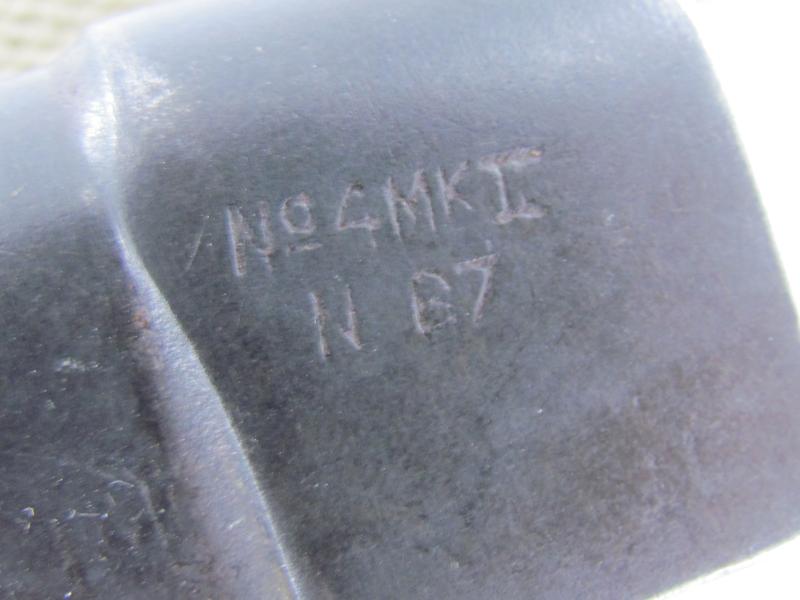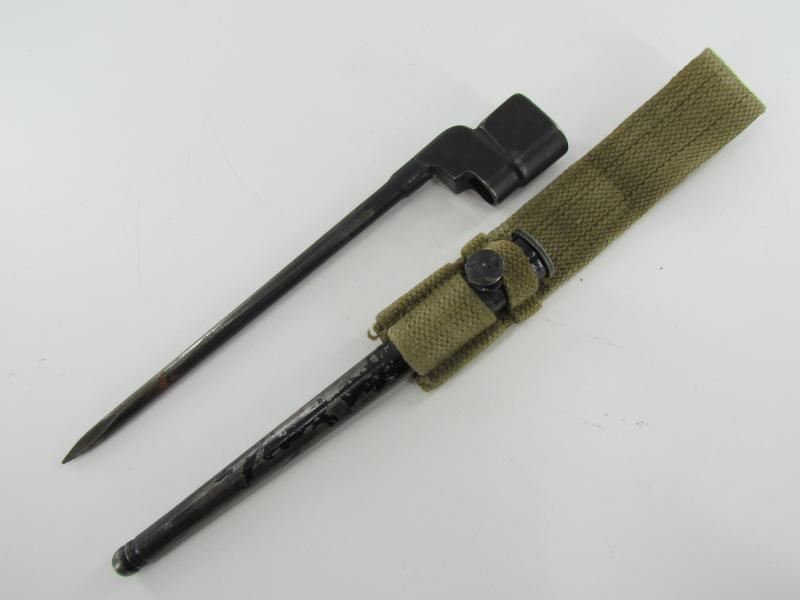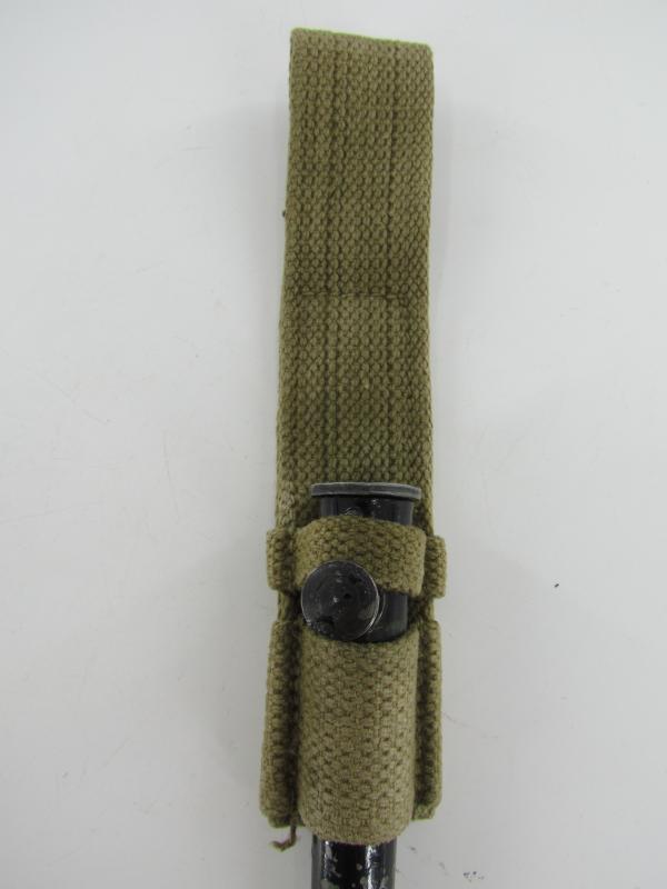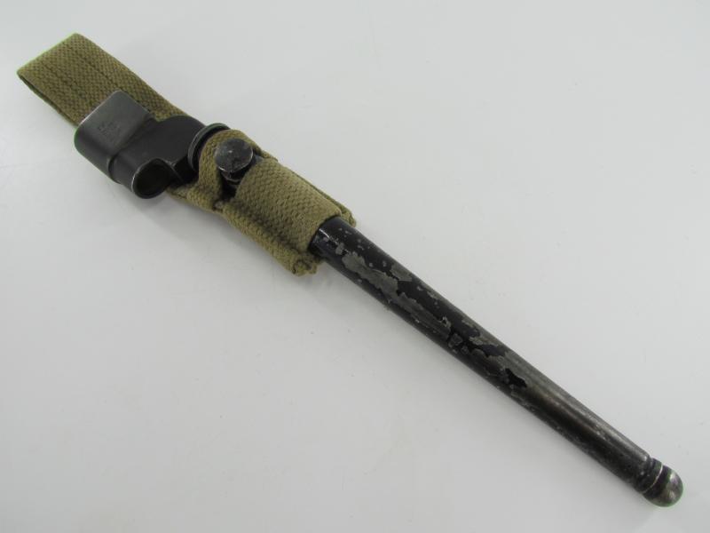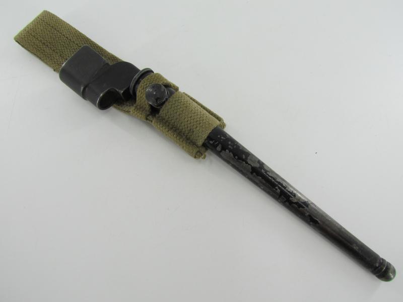 British Spike Bayonet No.4 MK II, complete with blancoed webbing frog. Marked but hard to read Nice original bayonet and frog in good used condition!