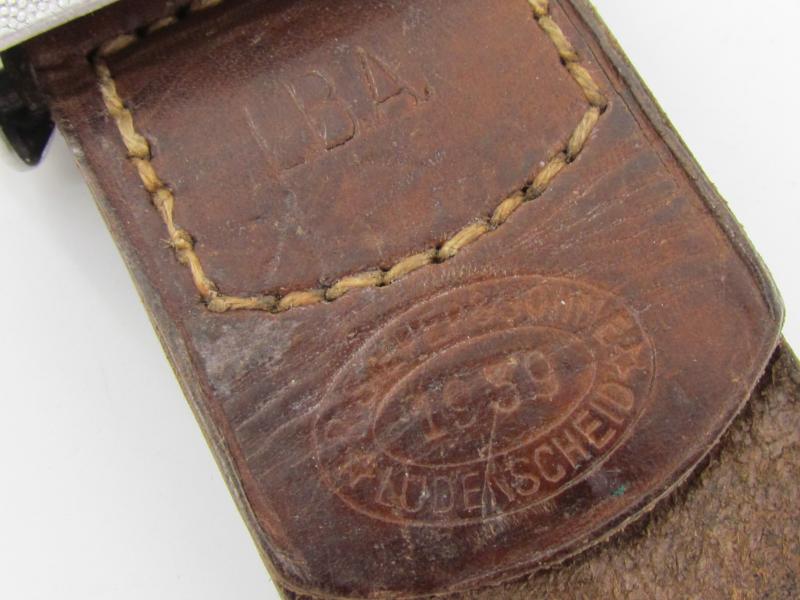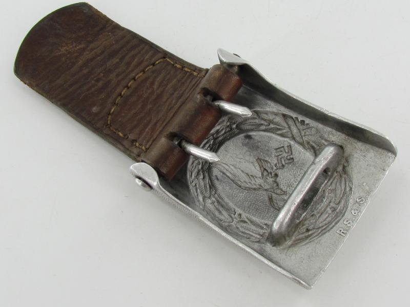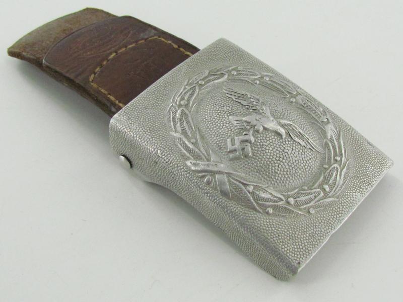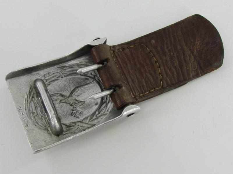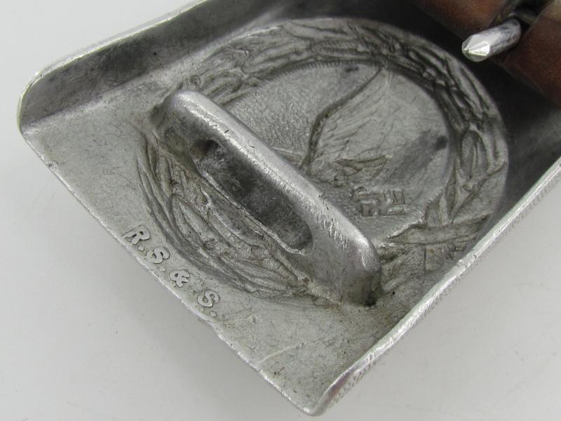 Nice and worn early Luftwaffe belt buckle executed in aluminum.The buckle is complete with leather tab, that shows the maker mark of the firm Richard Sieper & Söhne, Lüdenscheid (R.S.&.S) and the manufacturing date 1939
