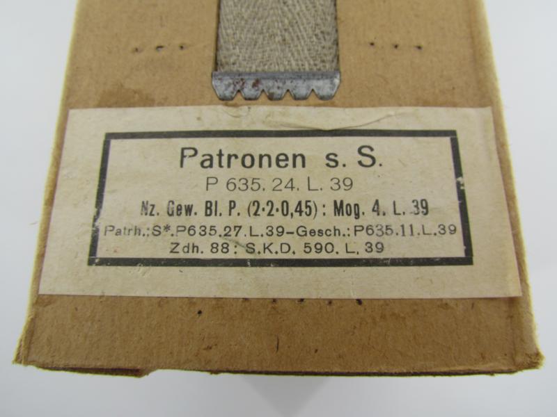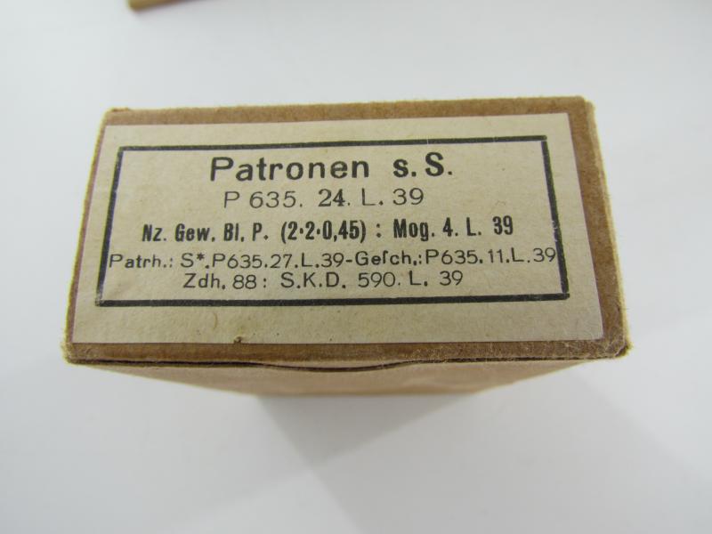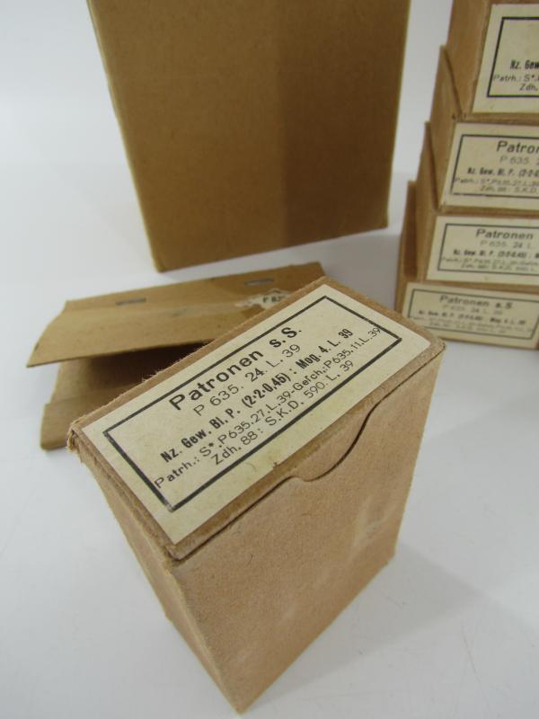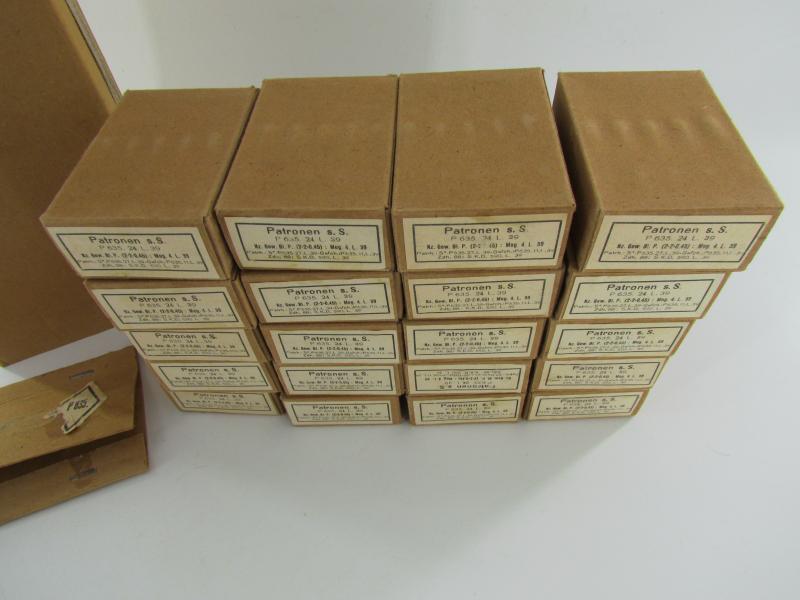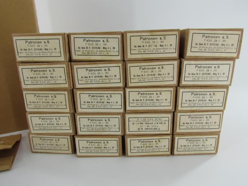 Original carton sleeve with its 20 matching 8x57, (7,92 mm), K98 ammunition boxes. The carton sleeve is containing 20 standard carton ammunition boxes, (empty, NO ammunition). All boxes including the sleeve are matching.