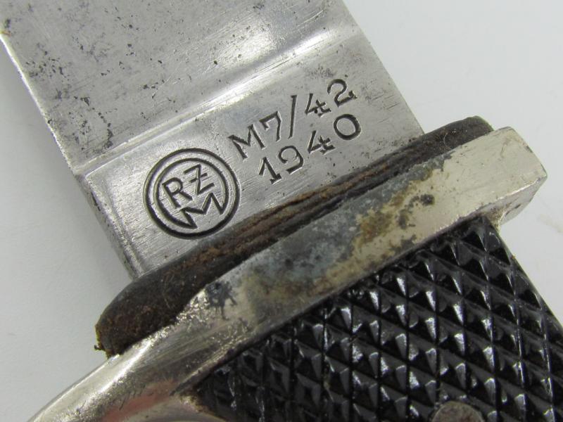 It’s maker marked on the reverse ricasso with the round “RZM” emblem and the maker code “M7/42” indicating manufacture by the firm of WKC SOLINGEN