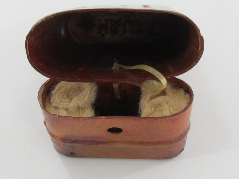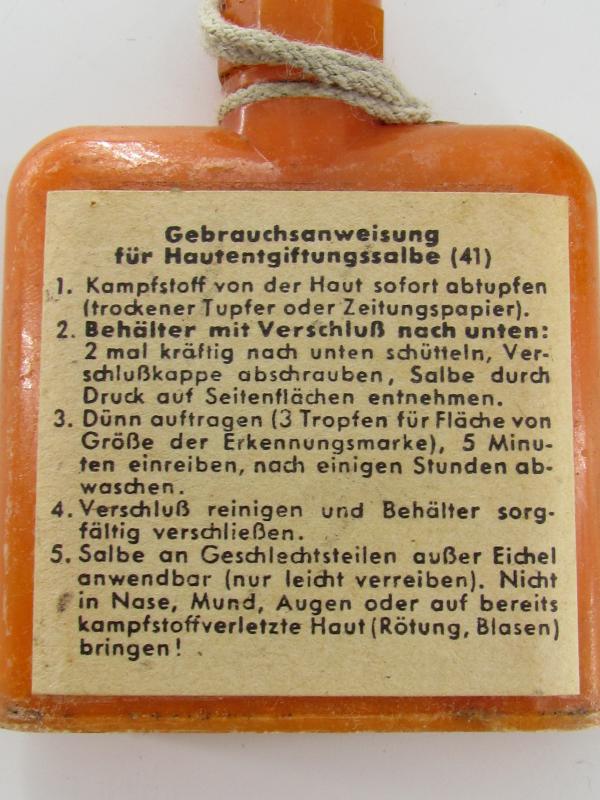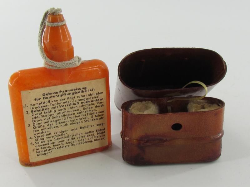 This ointment was used to detoxificate the skin after a gas attack. Orange coloured ointment flask complete with label, stored in a protective carton container, complete with original cotton swabs.
