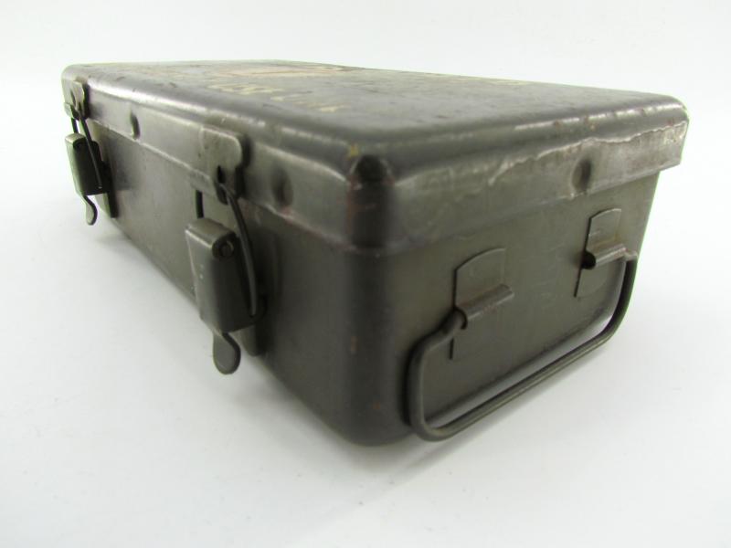 Complete with content. Metal box with good working locks and most of its original olive drap camo paint.