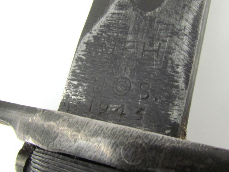 The bayonet is manufactured by UFH (Union Fork & Hoe of Columbus, Ohio) dated 1943