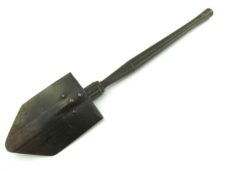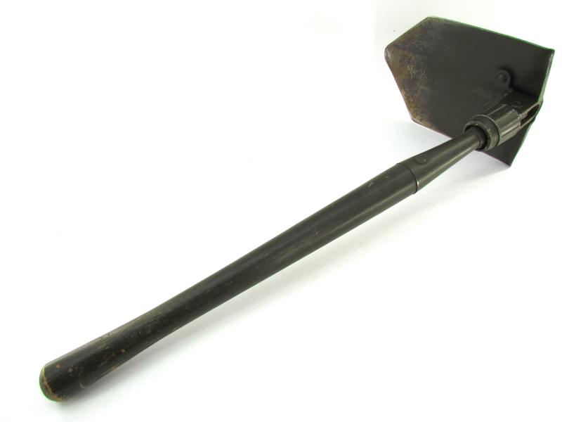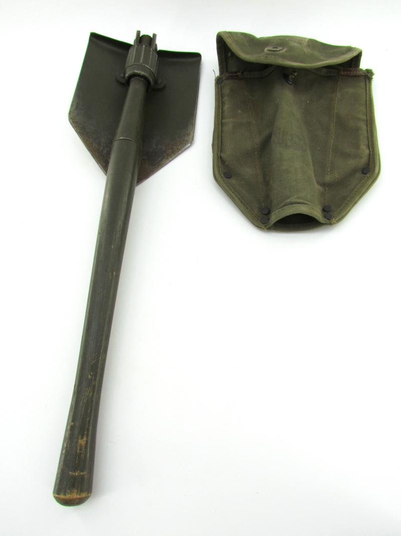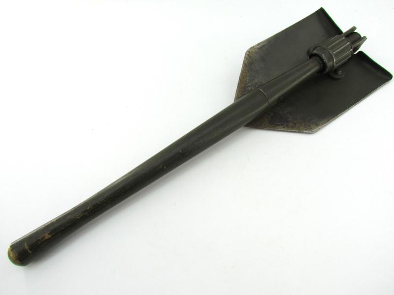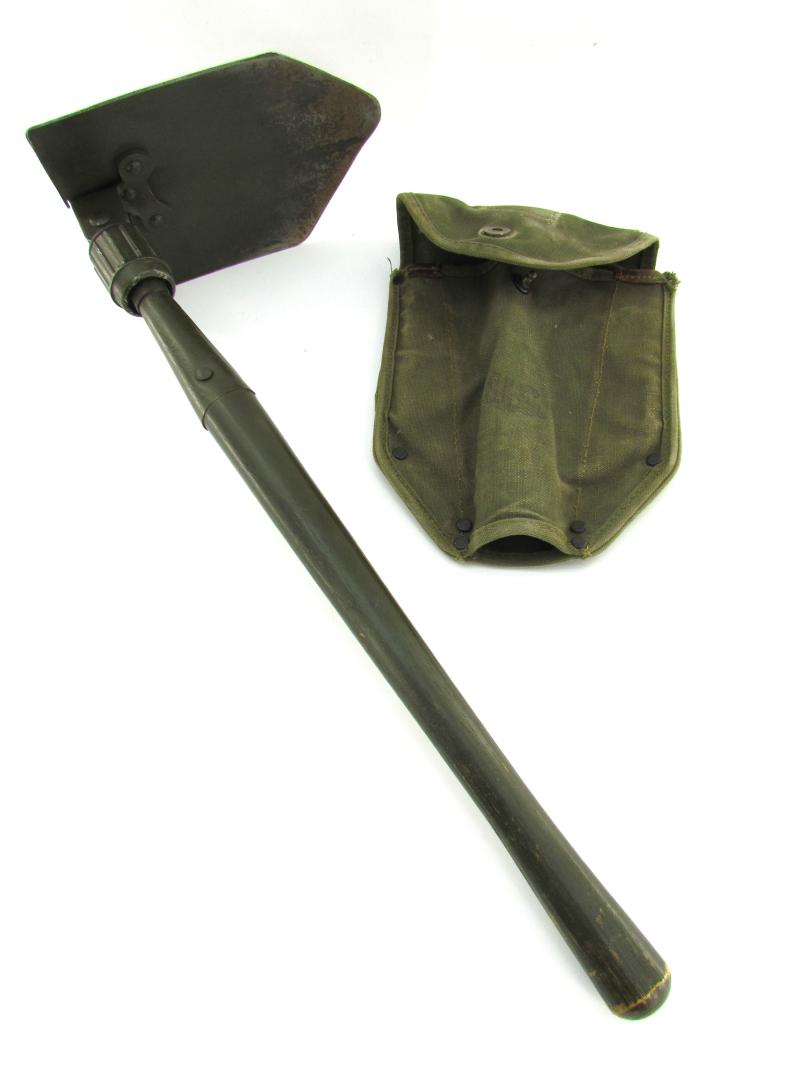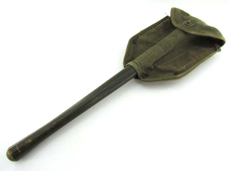 A very nice US WW2 folding shovel. Maker marked and dated “1944” In most of its original olive drap camo paint in early model shovel cover. In very good condition.