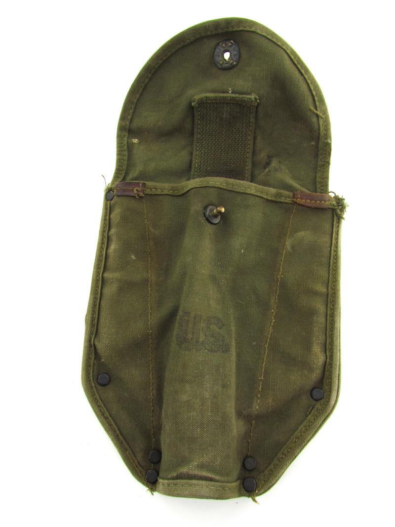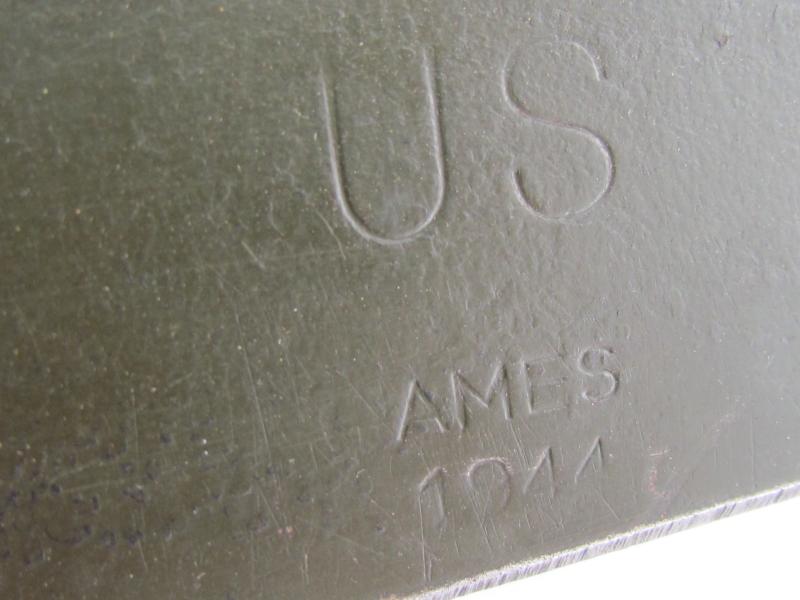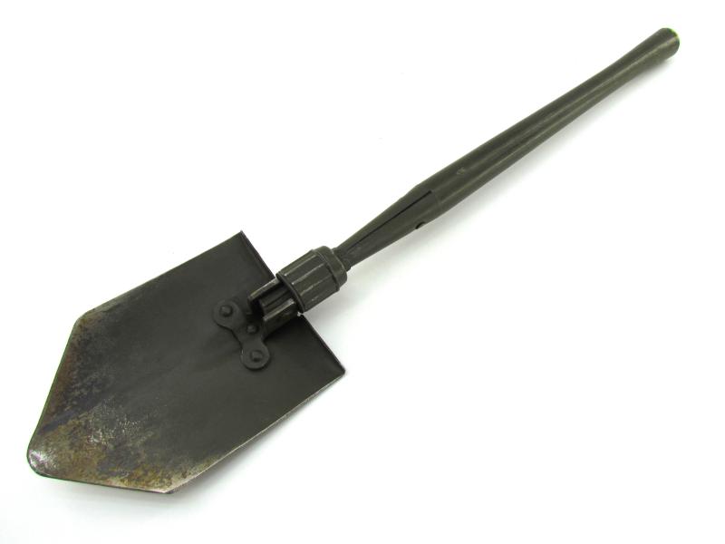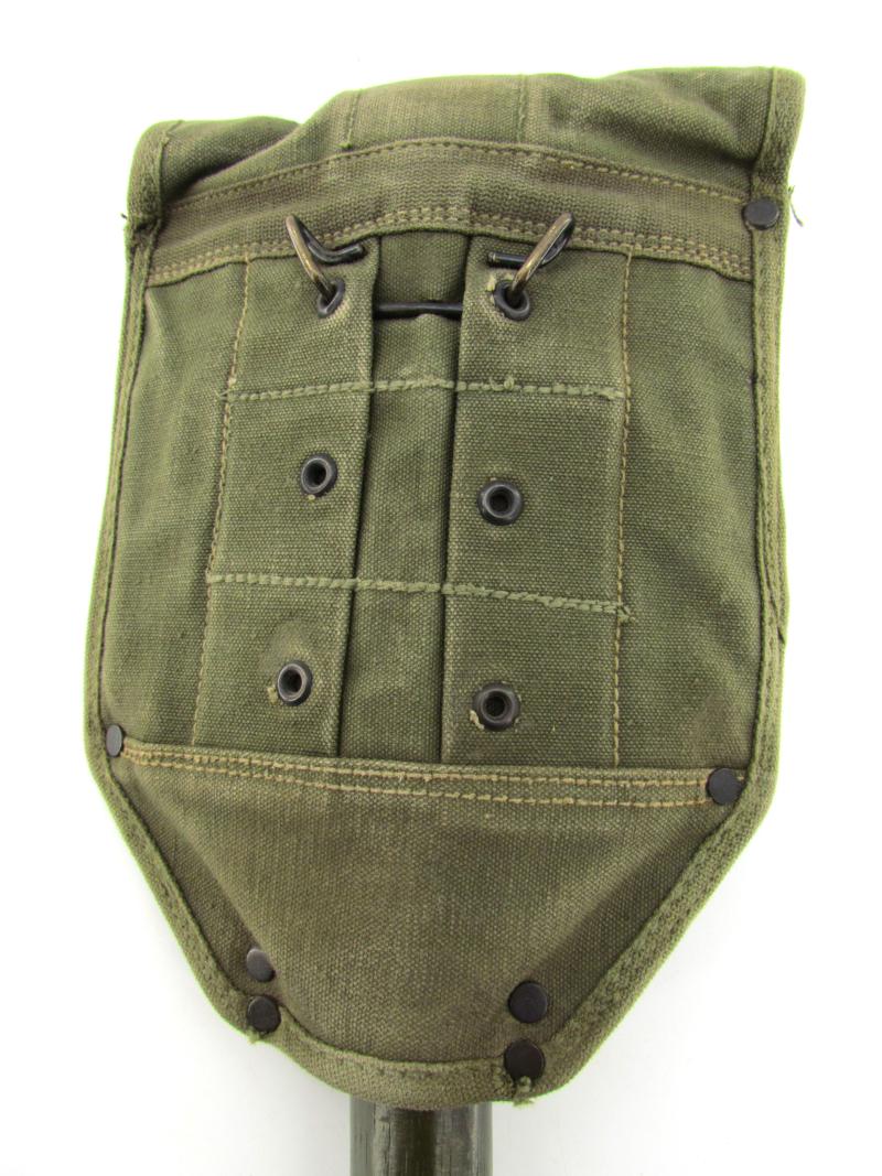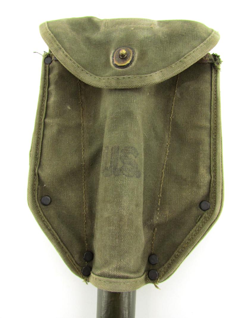 A very nice US WW2 folding shovel. Maker marked and dated “1944” In most of its original olive drap camo paint in early model shovel cover. In very good condition.