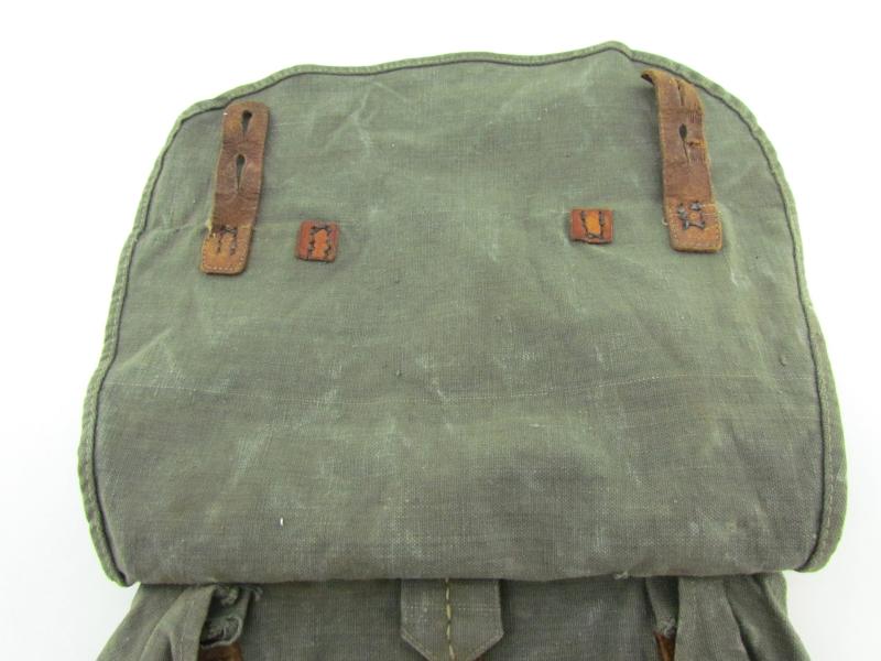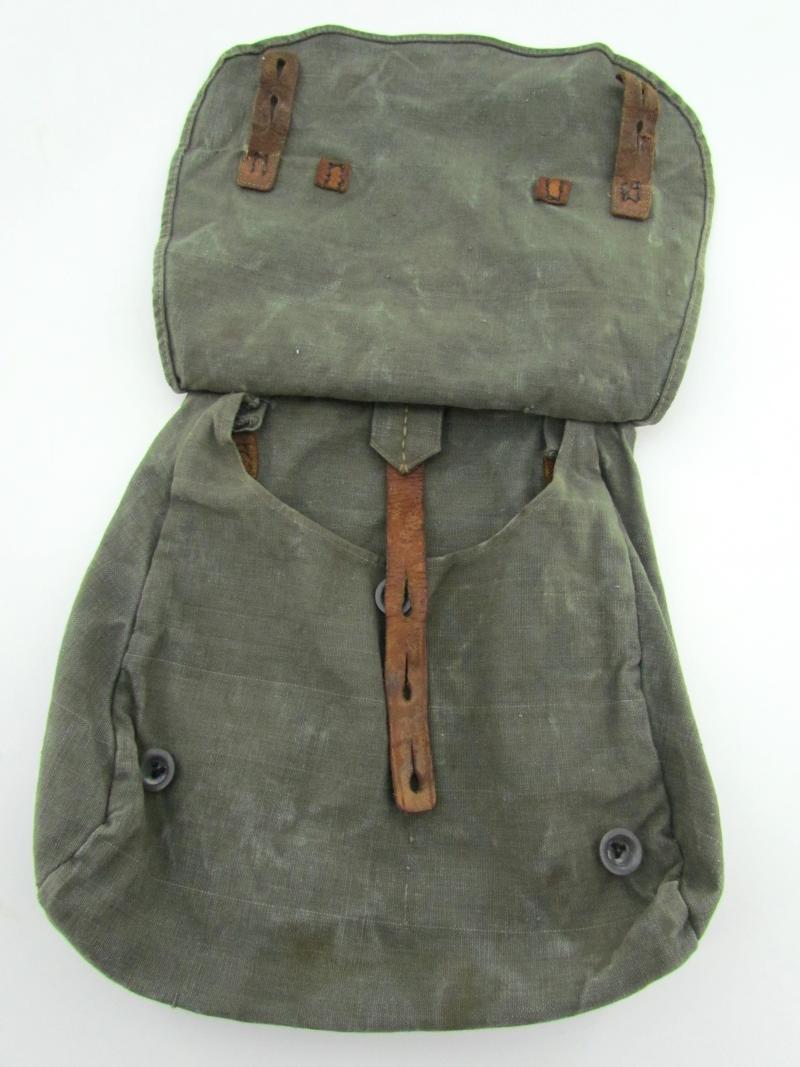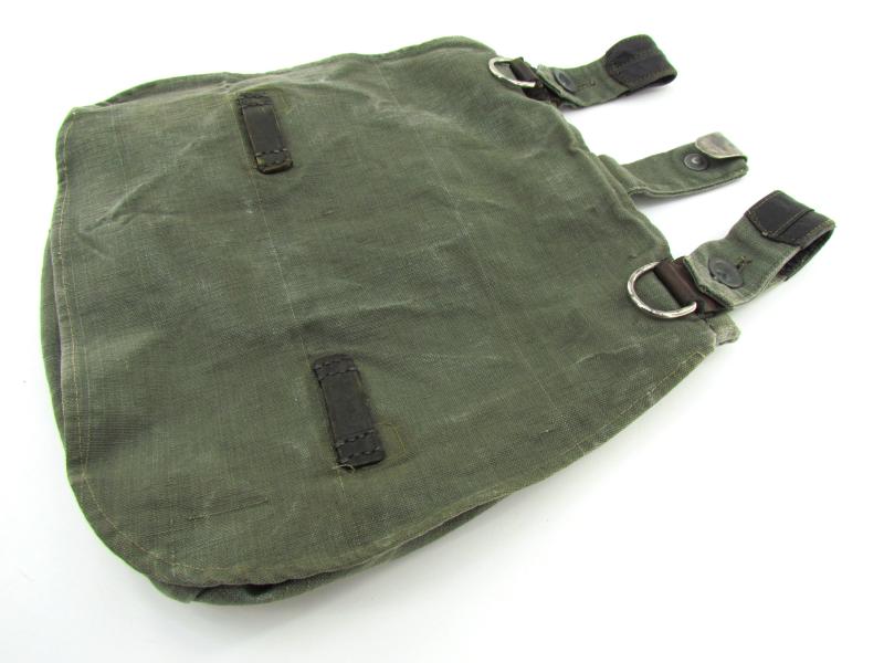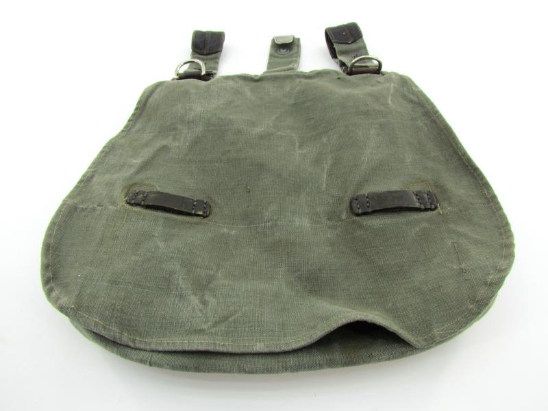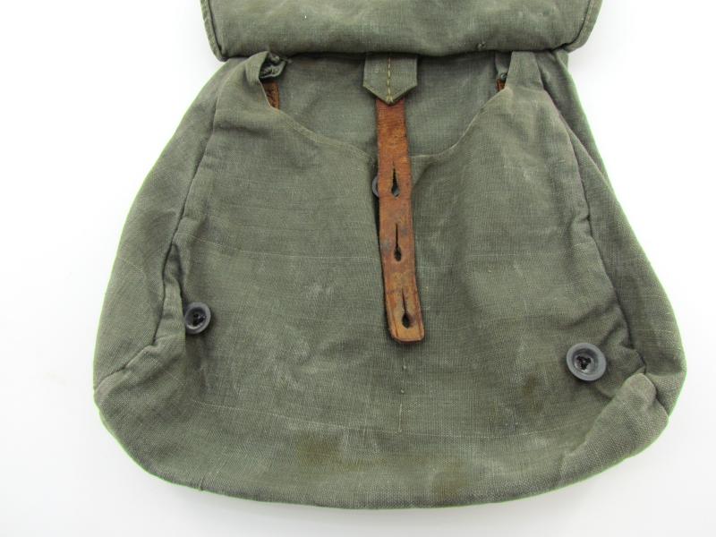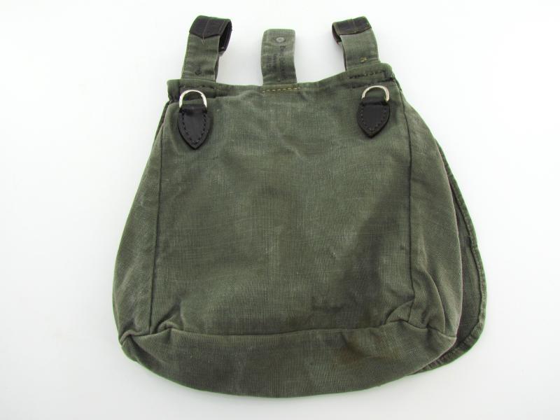 This is an example which is made of heavy quality teal-green coloured canvas, the breadbag is re-inforced with lacquered leather parts.