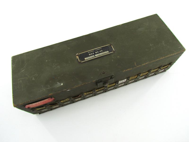 Nearly complete U.S. Army Signal Corps Box BX-49 Phila-(19)43. The box can hold 12 sets of RX & TX and antenna coils. To be used with BC-611 Handie Talkie radio’s. In very good condition.