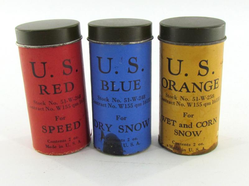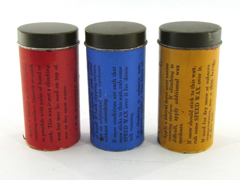 Orange ski wax for wet and granular snow, blue for dry snow and yellow for wet or corn snow, manufactured by F. H. Wiessner, Inc.
