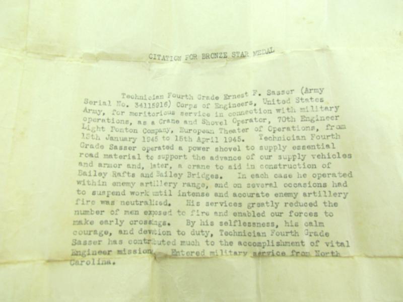 Inside there is a letter that this one was Awarded to Technician fourth grade Ernest F.Sasser ( See more info in the letter )