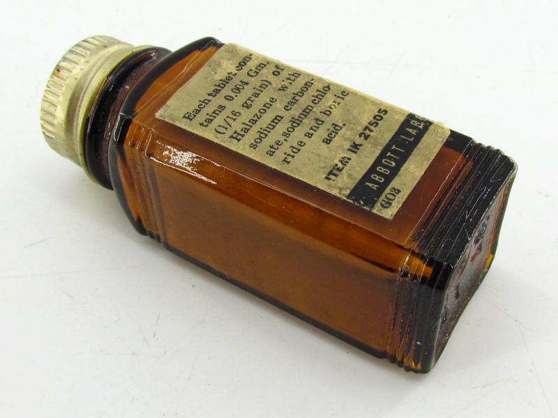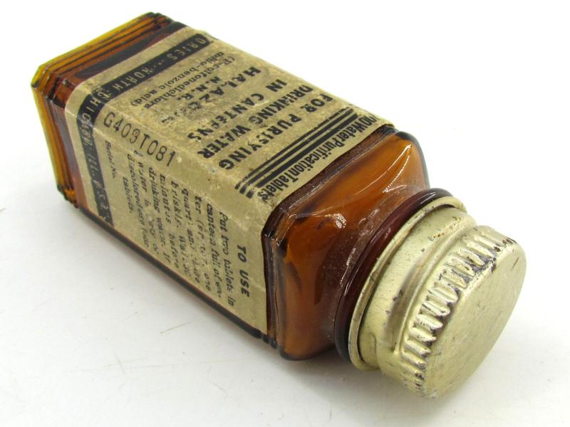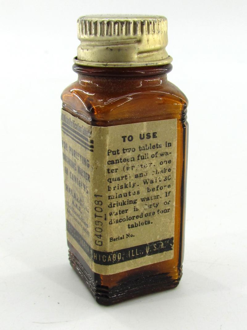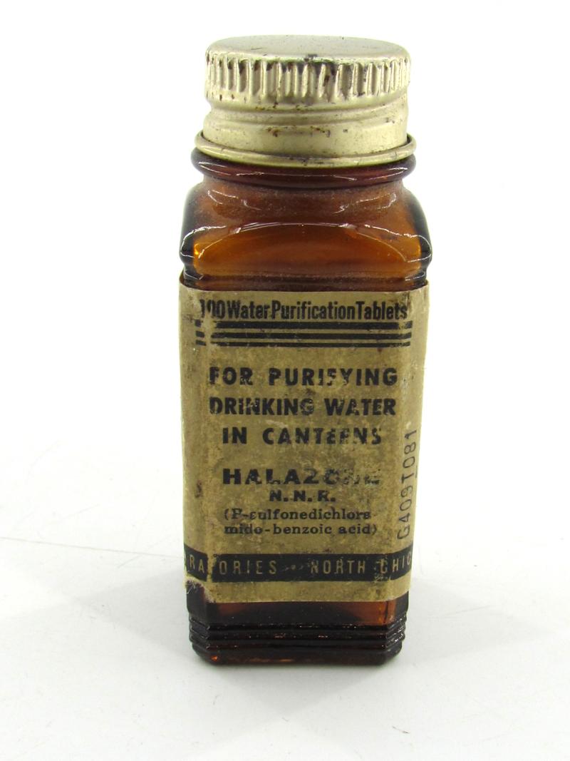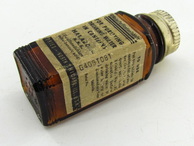 US WW2 Water Purification Tablets To remove salt from water so it can be used as drinking water The glas bottle is nicely paper tagged and in very good condition