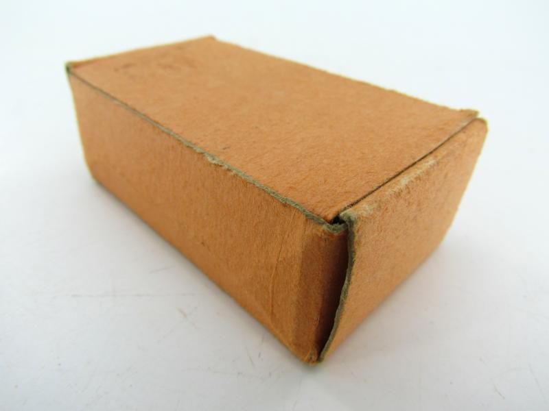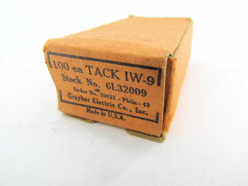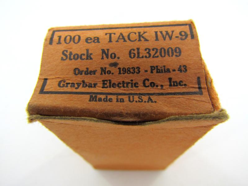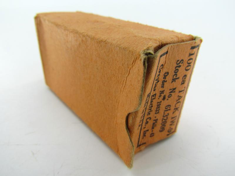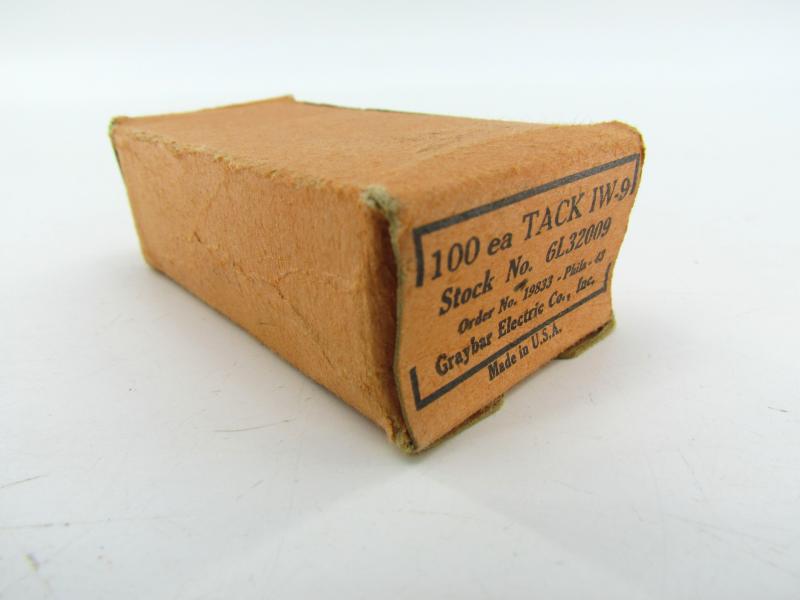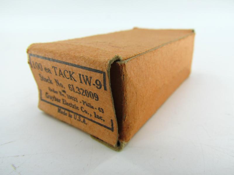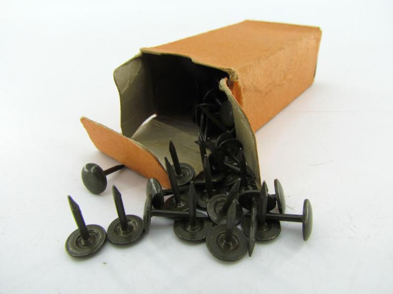 Box of 100 American military WWII regulation nails/tacks, painted in camouflage green, with markings on the box, date and stock number and order (not counted if all 100 are present)