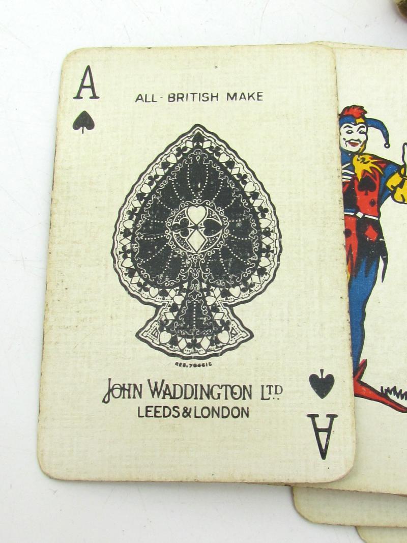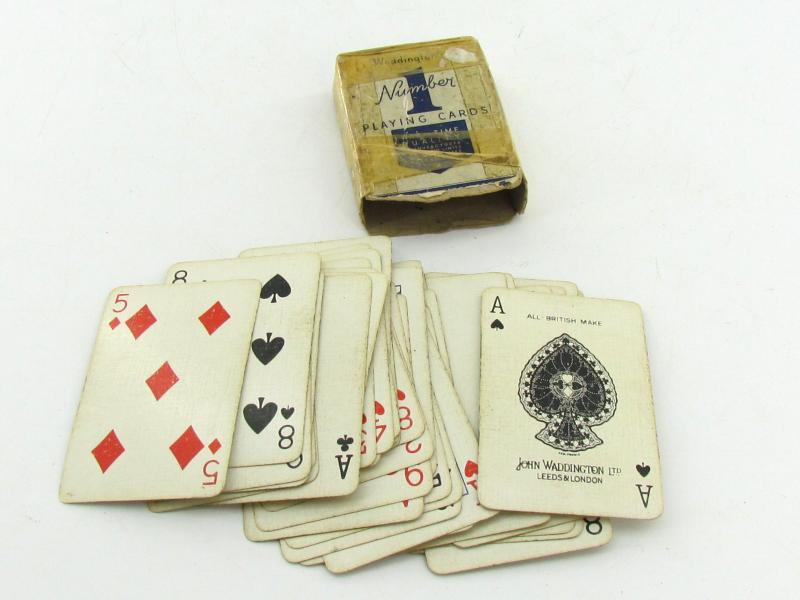 The cards are inside a blue and white printed cardboard box with the words "Waddington's Number 1 PLAYING CARDS WAR-TIME QUALITY MANUFACTURED WITHIN THE LIMITS OF WAR-TIME RESTRICTIONS" on both sides