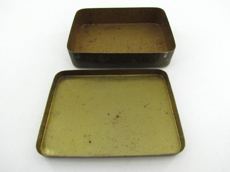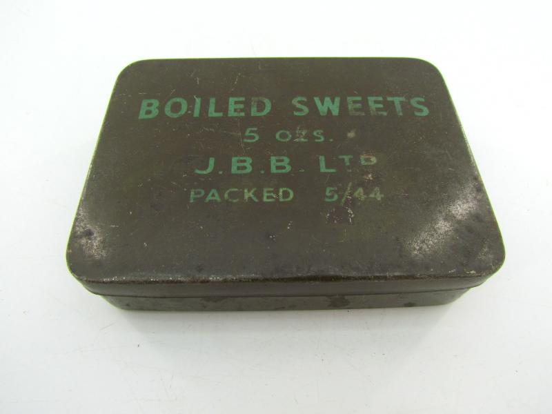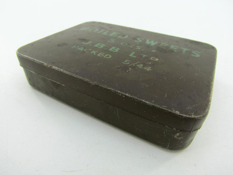 A British ‘Boiled Sweets Salt & Matches” ration tin. The tin is maker marked J.B.B. Ltd and dated 5/44.