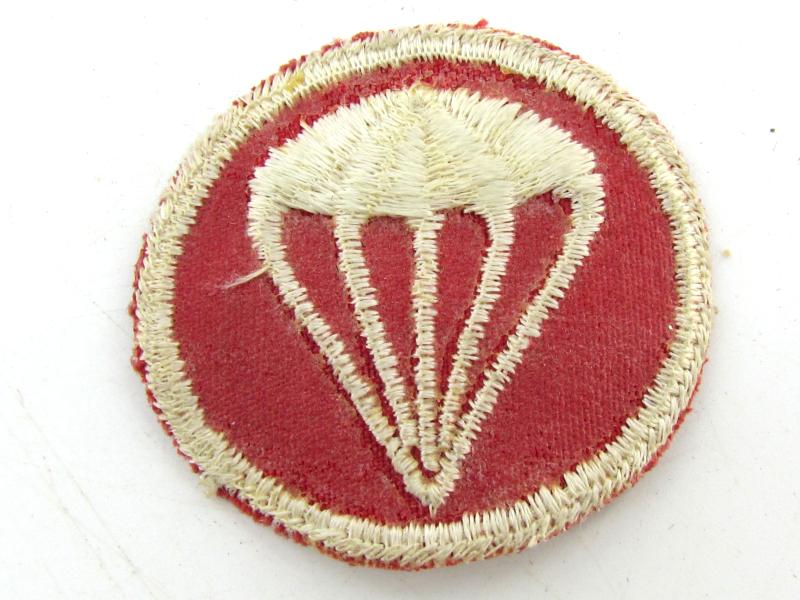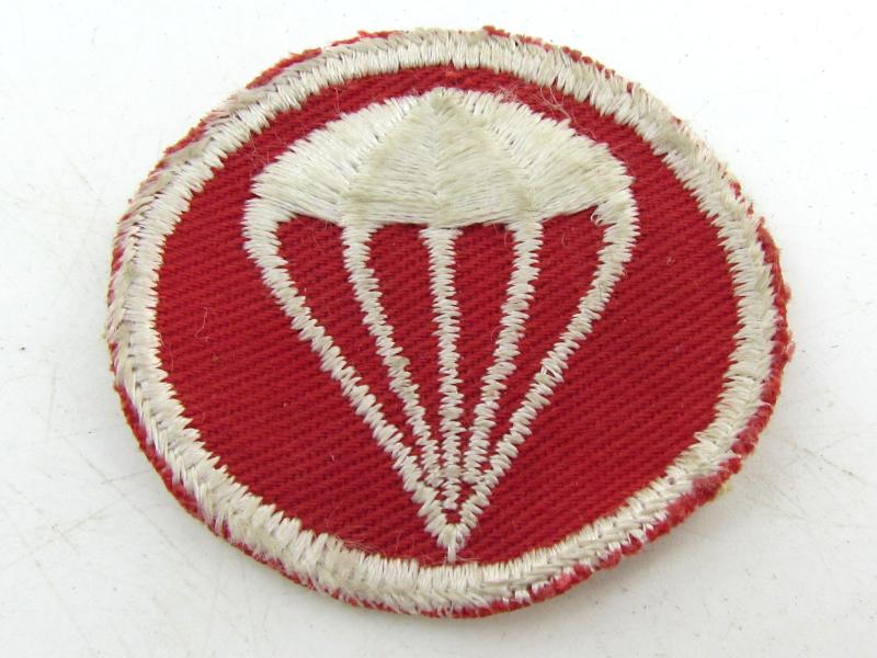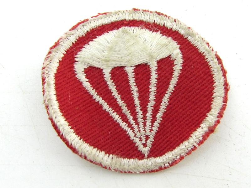 In a very good condition a nice early US WW2 Paratrooper Garrison cap badge. The white embroidered parachute on a red background indicate use by the parachute Artillery.