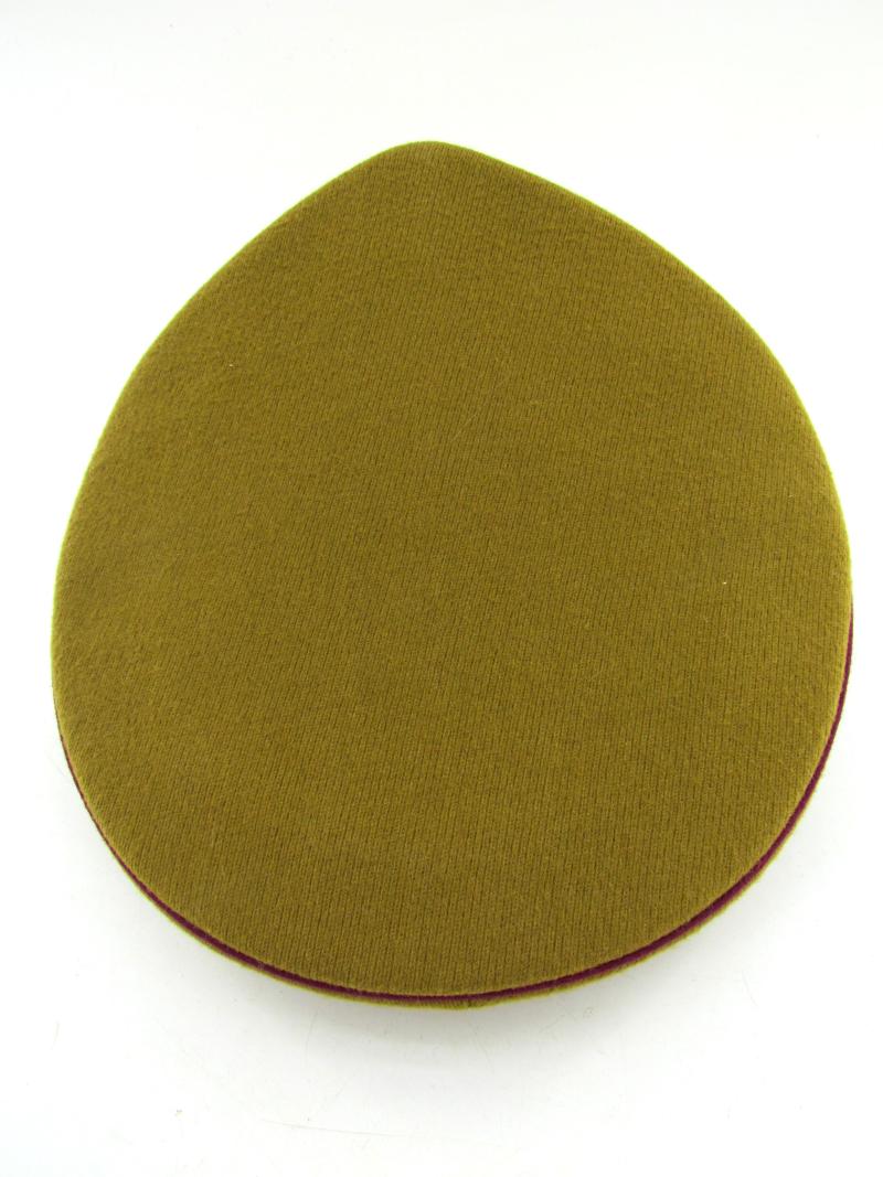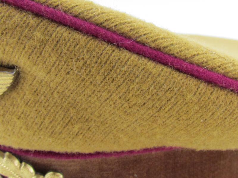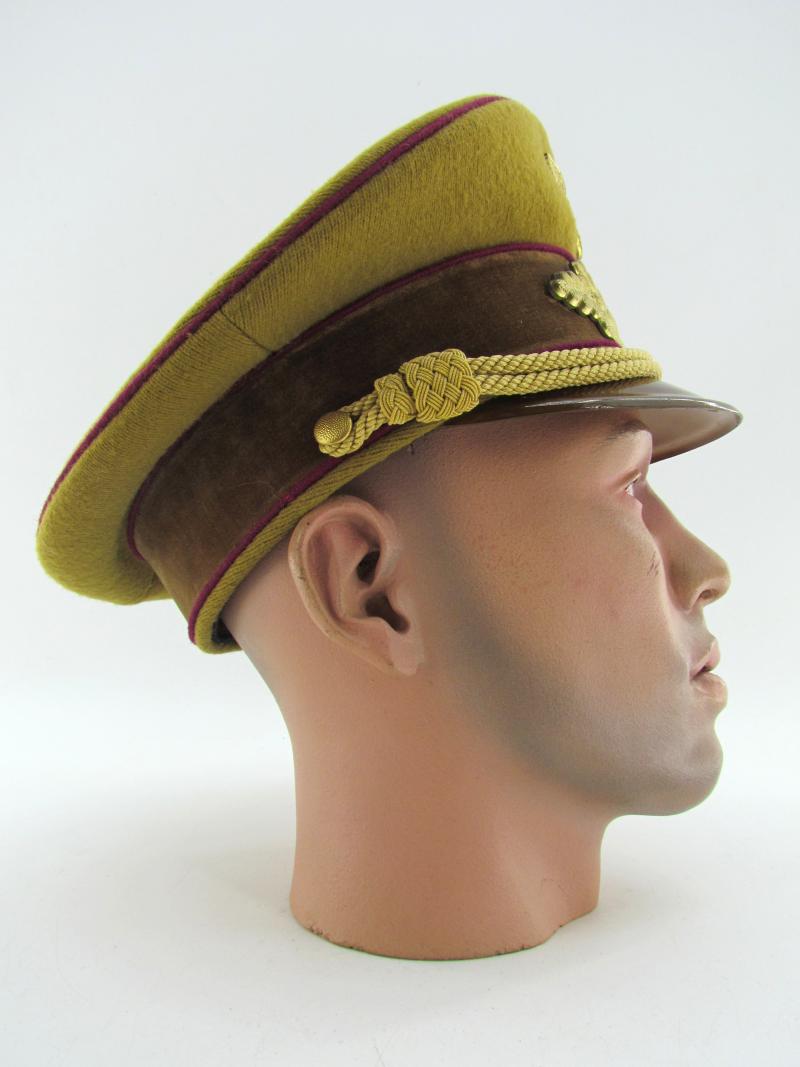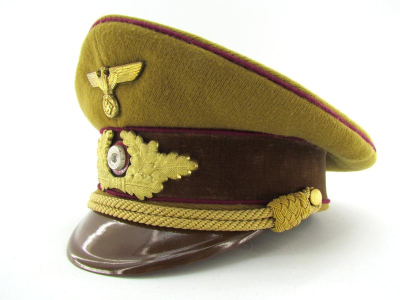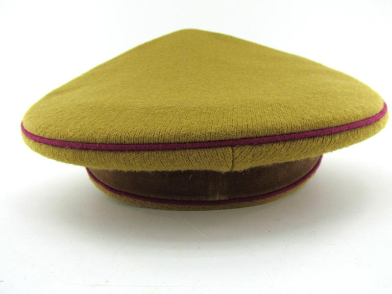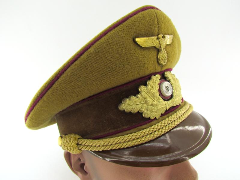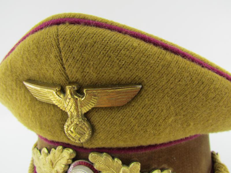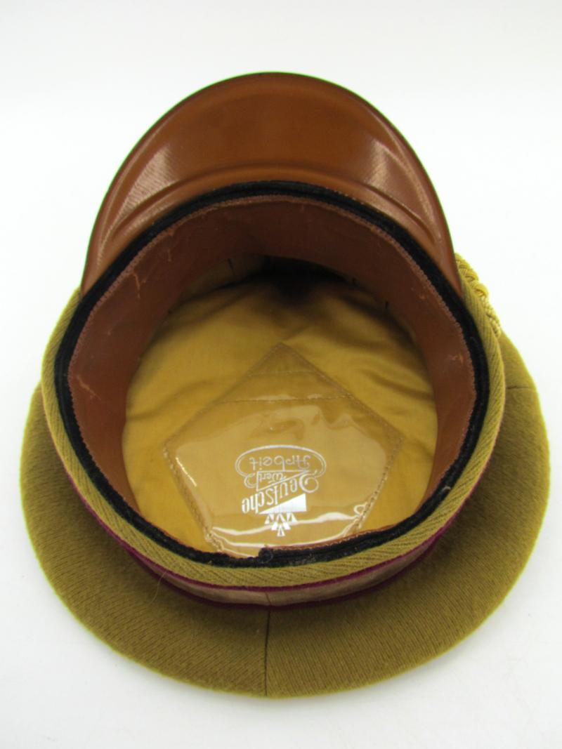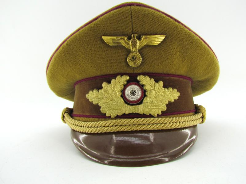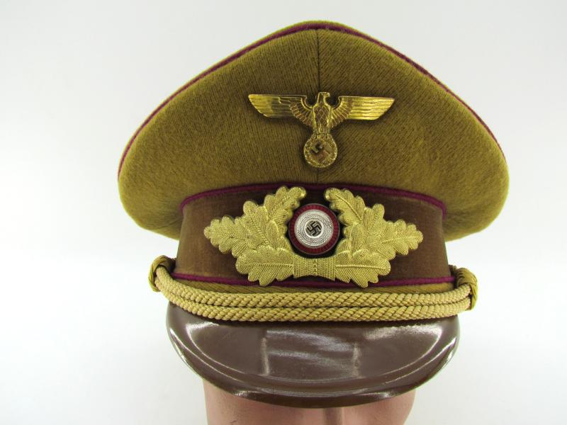 (NSDAP Schirmmütze). Constructed of smooth light brown wool and three bands of Bordeaux red waffenfarbe and a brown velvet centreband, with a gilt national eagle, wreath and cockade,