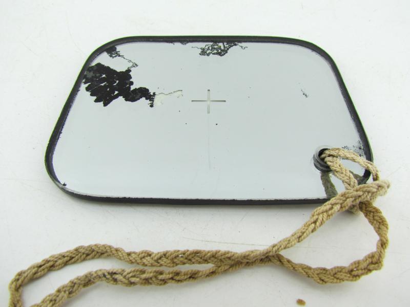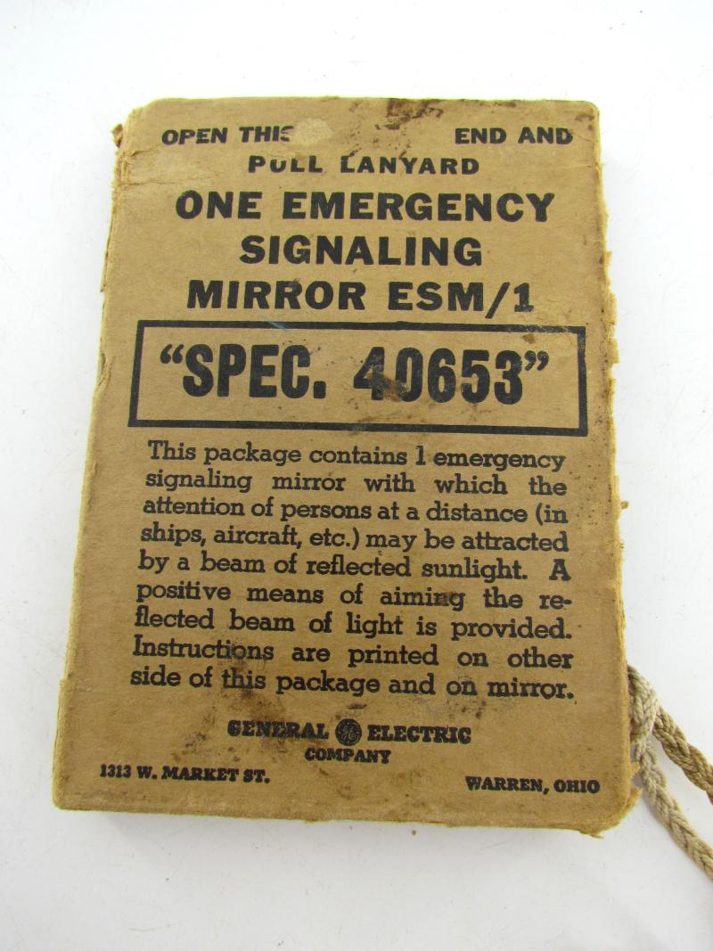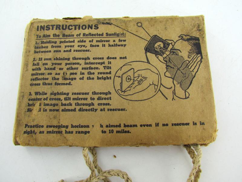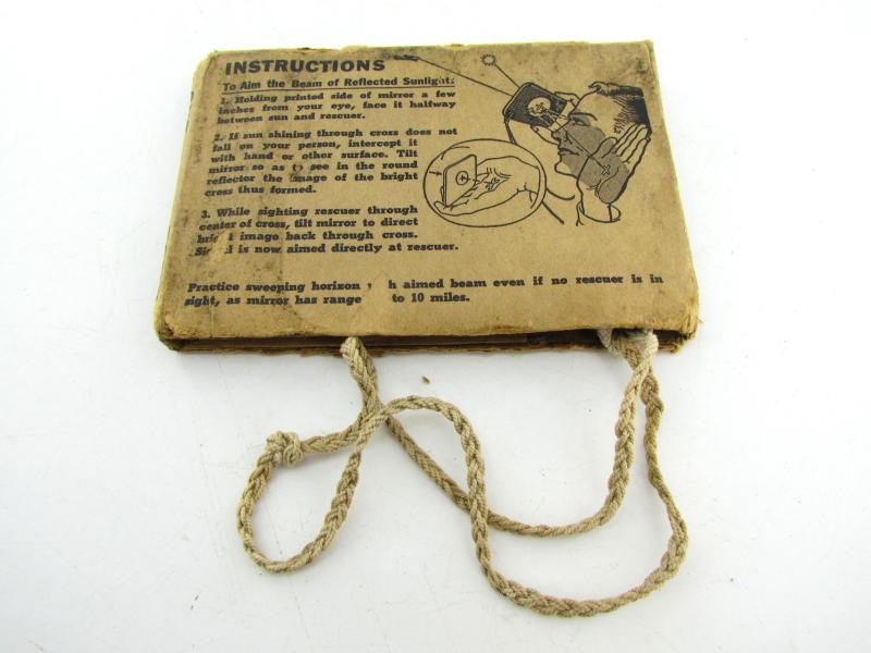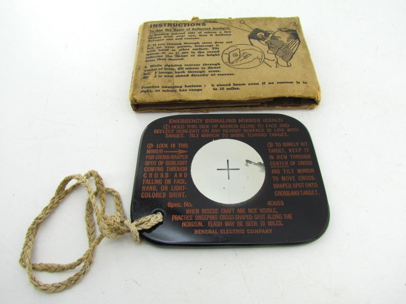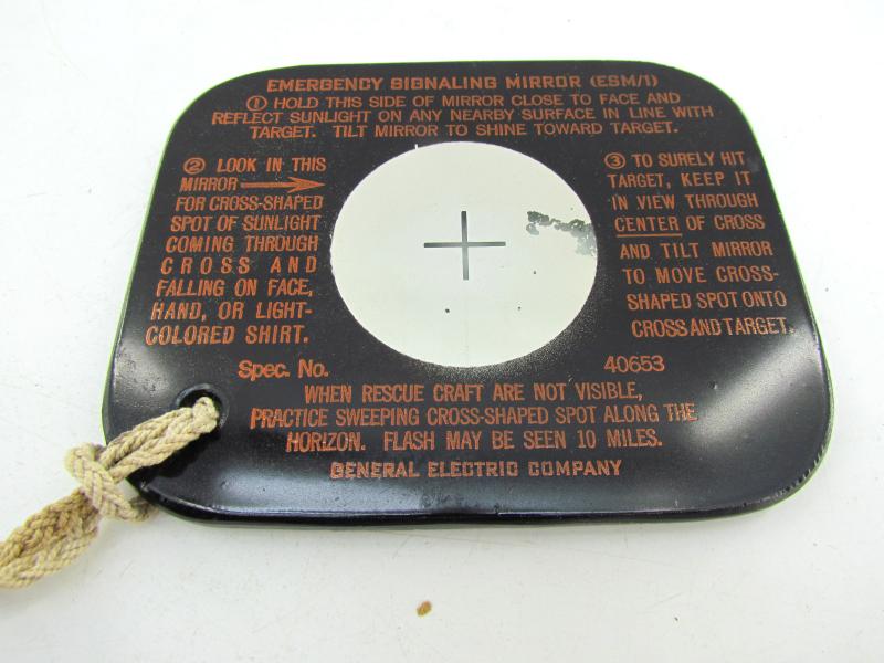 By the General Electric Co. Approx. 12.5 x 10cms. Mirrored glass with centre sighting cross and instructions for use printed to one side. With attached cord lanyard. These were included in several of the life-raft kits, the C-1 survival vest, and the types E-5, E-11 and E-12 emergency kits. Good used condition but has surface wear and scratching etc.