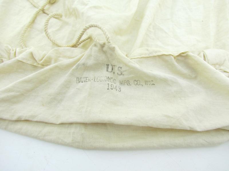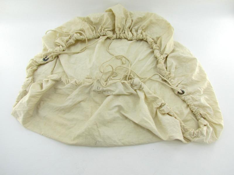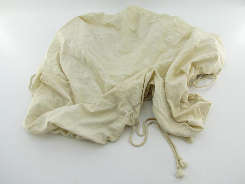 White canvas cover, original Second World War, ensuring the camouflage of the backpack of mountain troops in snowy terrain. It tightens around the backpack with a cord. Maker marked and dated 1943