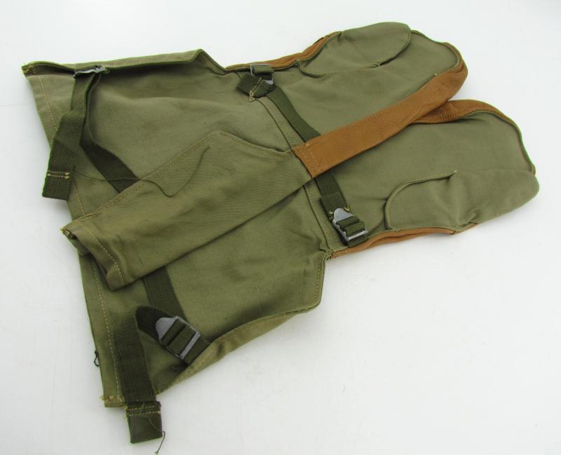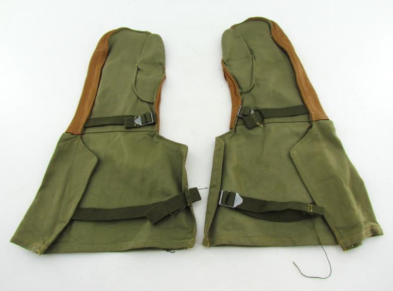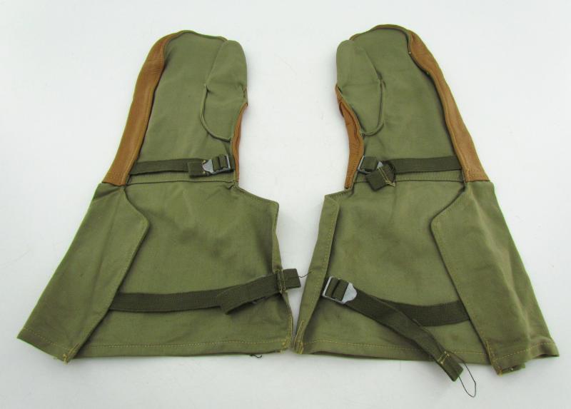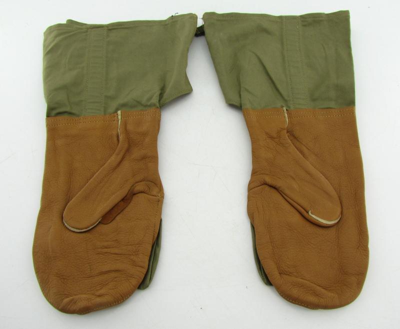 Pair of US regulation mittens. 'Mittens Shell trigger finger Type 1'. Cotton fleece and tan leather mittens. Two tightening straps.