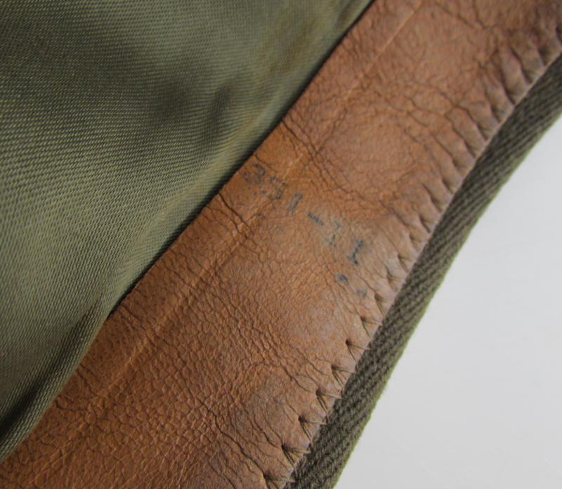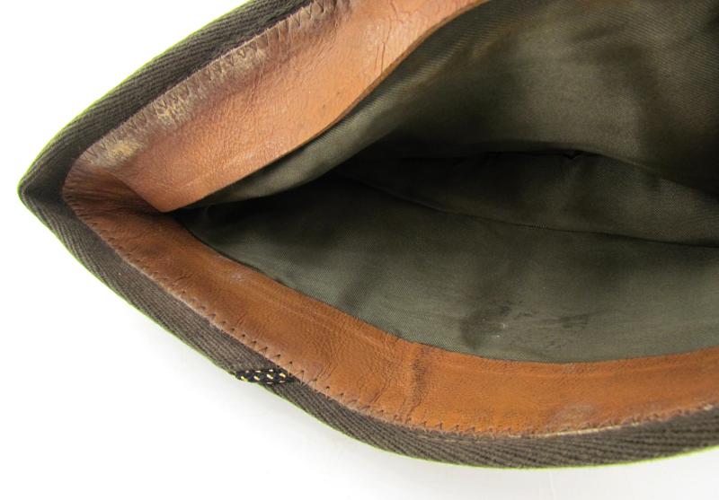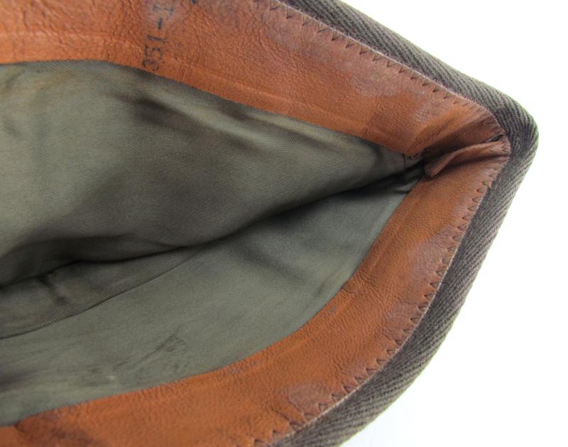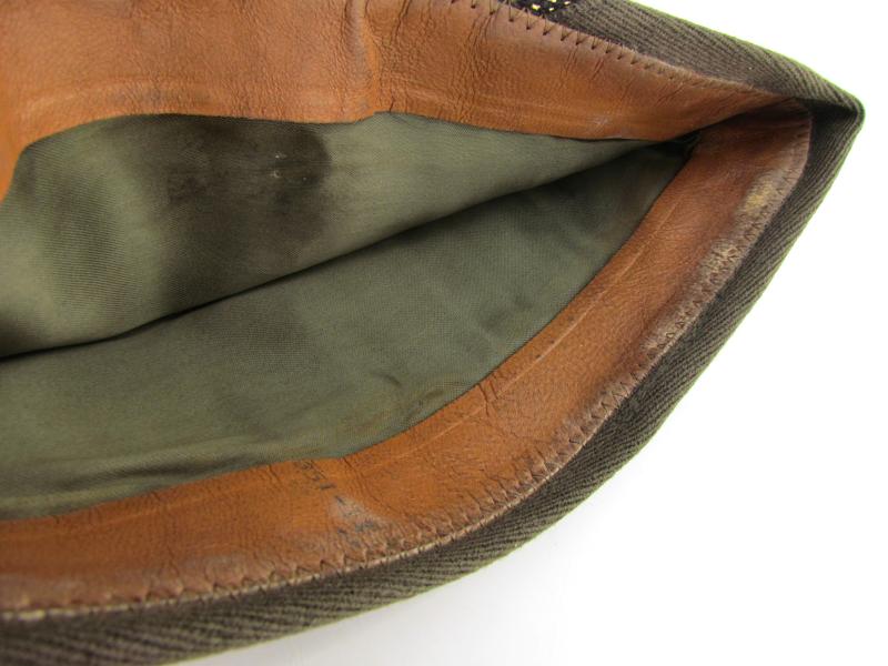 This hat is made from the Standard green wool elastique fabric used on Officers caps during the Second World War which is sometimes referred to as ‘Chocolate’ and was intended to be worn with the pinks and greens uniform.