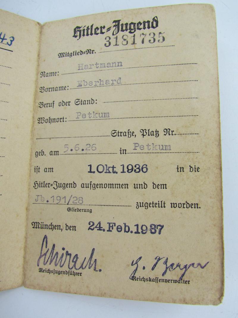 A nice grouping from a Hitler Youth memeber with also his member pass included ( Photograph removed,) Eberhard Hartmann is his name Several documents with his name on it
