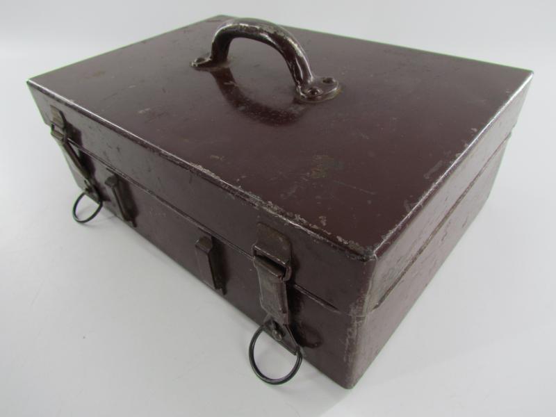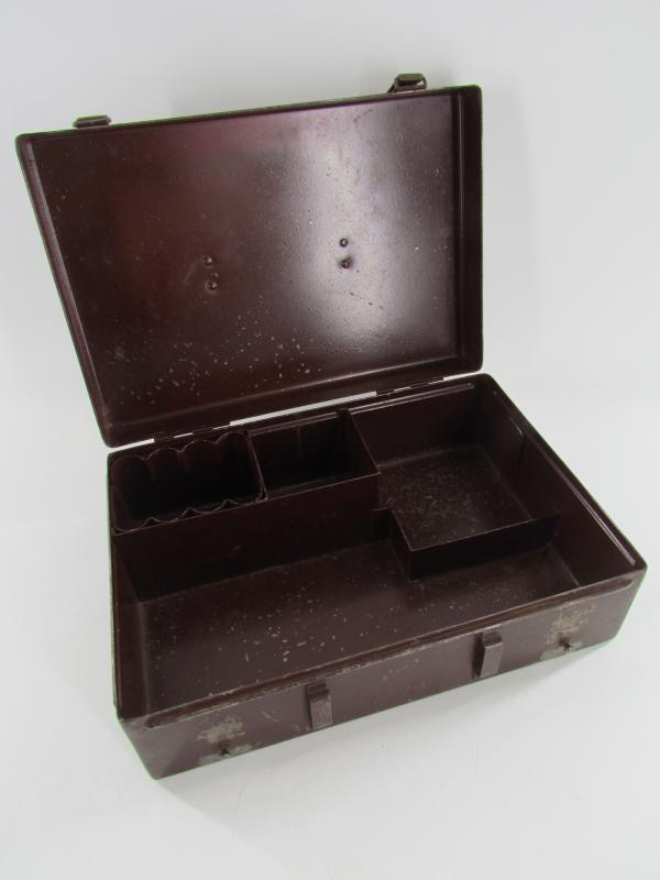 Rare original metal box for the Beleuchtungsgerät für Strichplatte or lightning for graticule. The box would contain the famous headlight (Stirnlampe), multiple batteries, cables and spare bulbs wich would be used to light the reticle lighting in various optics.