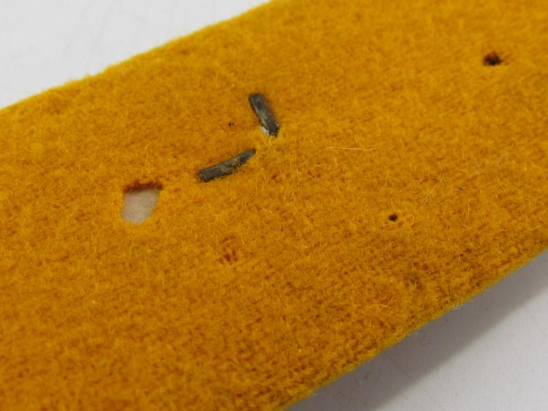 1x Sew on shoulder board of interwoven, silver/aluminum Russian braid mounted on golden yellow wool waffenfarbe bases. Single rank pip Length about 10 cm in used but good condition