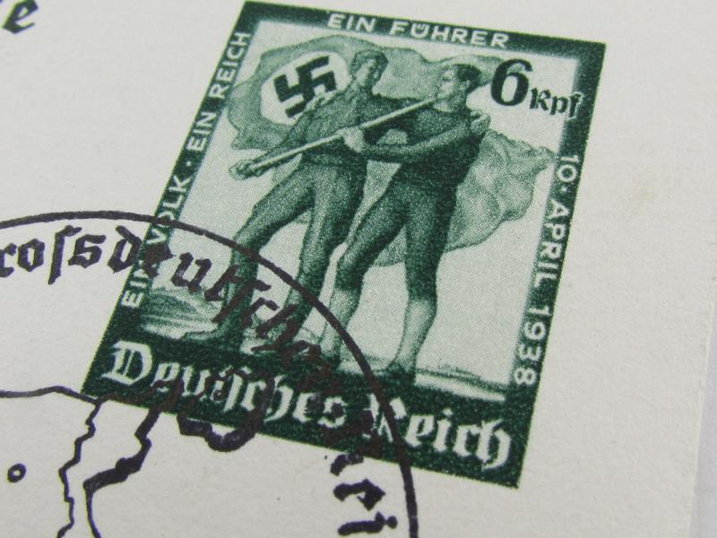 The card shows an artistic image of the territory of the German Reich with Austria, an eagle with swastika and a portrait of Adolf Hitler in very vibrant colours unissued condition !