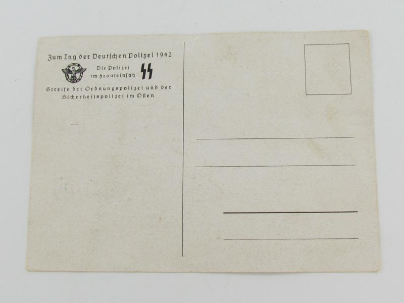 The postcard shows overall storage wear. On the back nicely marked with the Polizei decal and SS runen. 'Zum Tag der Deutschen Polizei 1942'.
