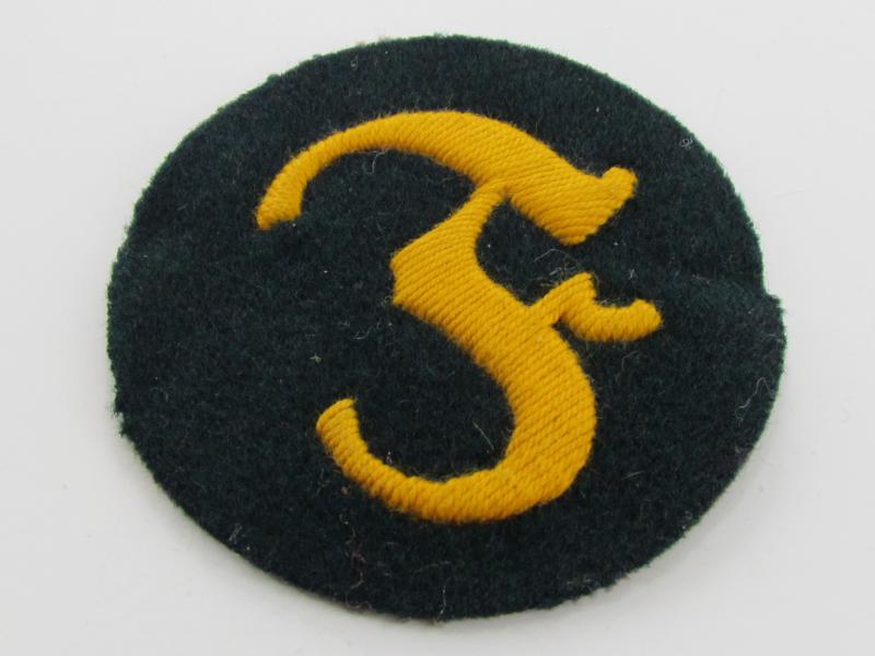 Early pre-1940, blue/green badge cloth base with a machine embroidered Gothic, “F” in golden yellow threads indicating Feuerwerker (Artificer/Ordnance Technician)