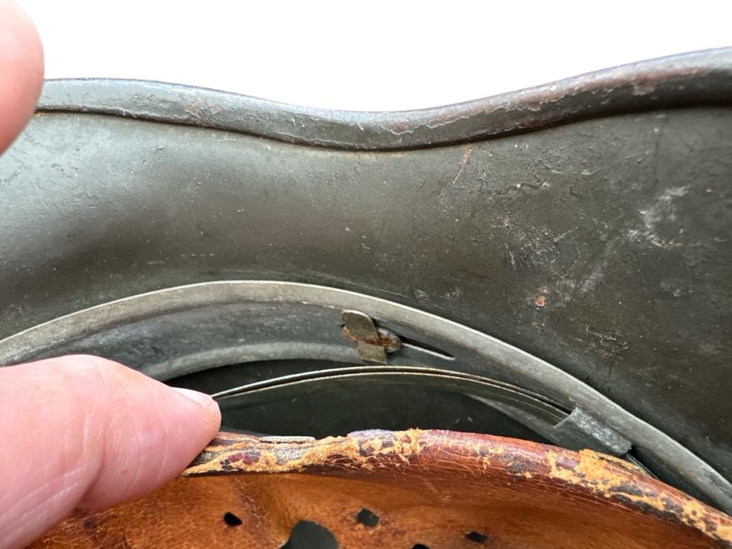 The stamped sheet steel construction M40 helmet retains almost all of its field-grey paint