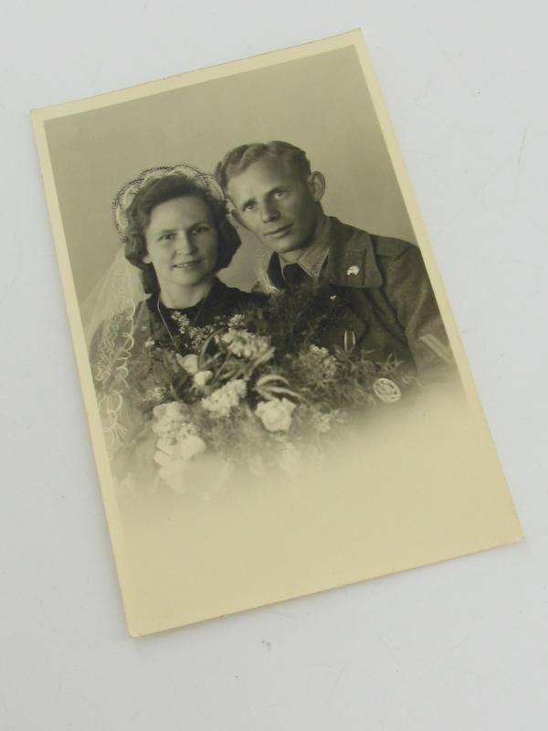 A very nice Portrait photo ( postcard ) of a Panzer ( Stug ) Soldier and his Wife about 14 x 9 cm