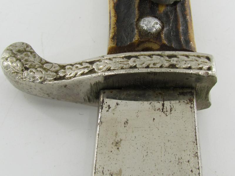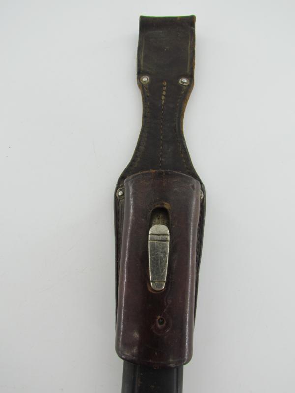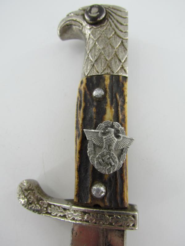 It was made in the Weimar period, then updated in the 1930s: the blade was shortened to 13 inches, the “clam shell” on the crossguard was removed, and the Weimar-era grip eagle was replaced with the correct Nazi-era wreathed eagle and swastika Polizei emblem ( the emblem is placed a bit diagonally but is stuck in place well )