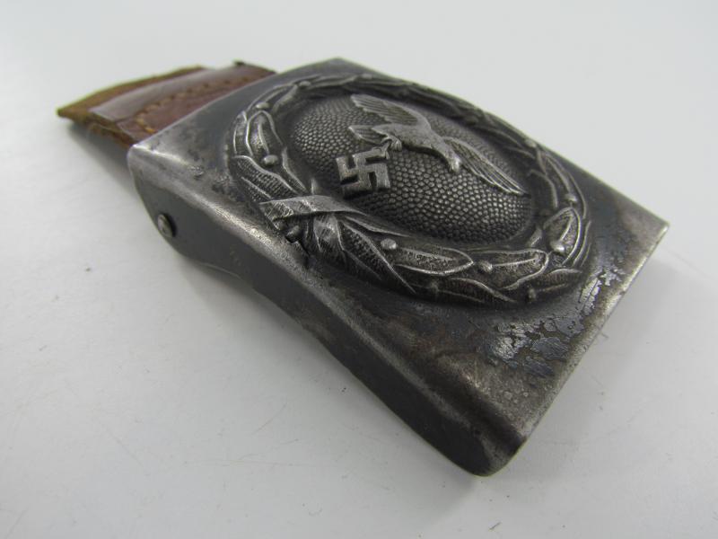 Luftwaffe belt buckle executed in steel. Retaining some of its genuine blue finish. Maker marked on the leather tab by F.W. Assmann & Söhne, Lüdenscheid dated 1941. in a good condition