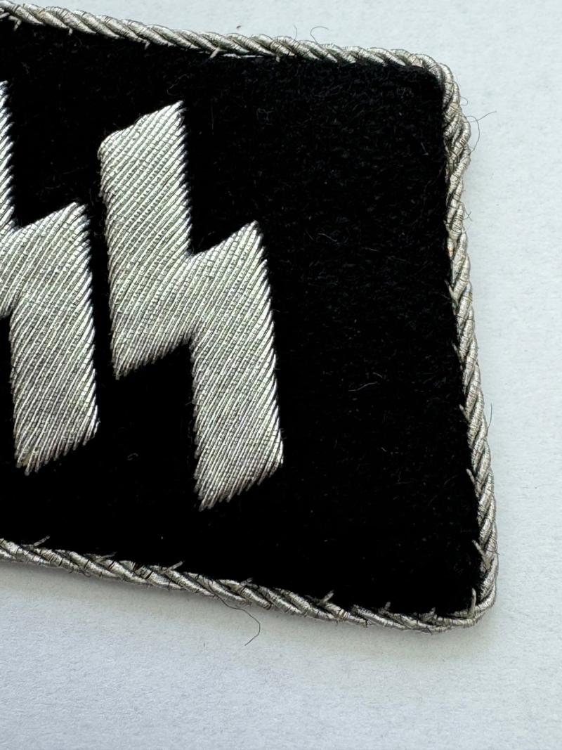 SS tab executed in silver bullion embroidered runes on black wool, having a classic SS-style ‘buckram’ backing.
